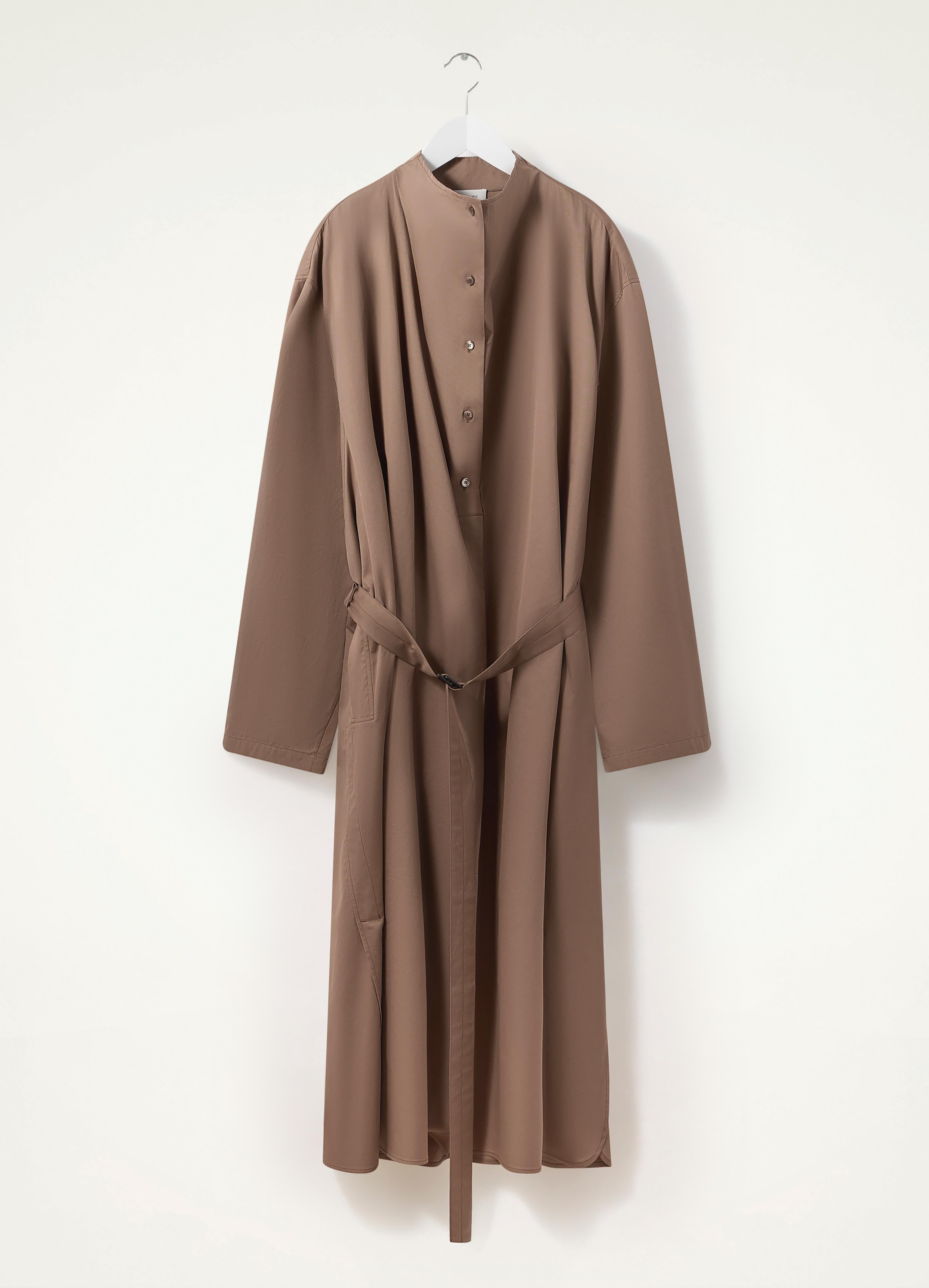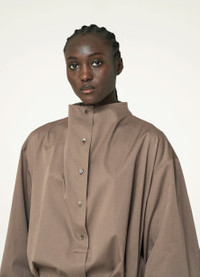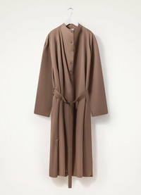 This dress is made of light cotton twill with a soft hand that is slightly shiny and a smooth drape. The silhouette is reminiscent of the rounded curves of a garment bag, draping from the neckline down into round shoulders. Its generous volume can be adjusted using the matching belt and it opens partially down the front with a buttoned french placket, and along the sides with long slits. DETAILS Loose fit Corozo buttons Removable matching belt with metal buckle Topstitching Below-the-knee length Two welt pockets Belt loops Made in Portugal Style : DR1040 LF824 This model is 180 cm and is wearing a size 36/S FABRICS & CARE Main Fabric : 100% Coton Do not wash Do not bleach Do not tumble dry Cool ironing Soft dry clean