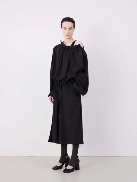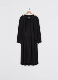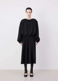 The Housse Dress is crafted in a light blend of viscose and wool with a warm and soft hand. The yoke, collar, and cuffs are lined in cotton for added structure and comfort. Inspired by a painter's smock, this dress features topstitching details throughout the shoulders and a cinching drawstring belt to tie up and create a blousing effect at the waist. On the top of the shoulders are corozo buttons to help open the garment to put it on. There is a feminine ruching effect at the top of the front yoke, and the voluminous, flowy sleeves feature adjustable cuffs with slits. The mid-calf-length skirt features in-seam pockets and slits on both sides. DETAILS - Relaxed fit - Coton lined - Corozo buttons - Side in-seam pockets - Gathered detailing - Contrast topstitching detailing Made in Romania Style: DR1081 LF1286 FABRICS & CARE Main Fabric: 85% Viscose / 15% Virgrin Wool Main Lining: 100% Cotton Trims: 100% Polyester Do not wash Do not bleach Do not tumble dry Cool ironing Soft dry clean