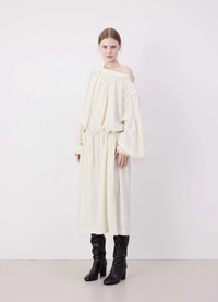 The Housse Dress is crafted in a light blend of viscose and wool with a warm and soft hand. The yoke, collar, and cuffs are lined in cotton for added structure and comfort. Inspired by a painter's smock, this dress features topstitching details throughout the shoulders and a cinching drawstring belt to tie up and create a blousing effect at the waist. On the top of the shoulders are corozo buttons to help open the garment to put it on. There is a feminine ruching effect at the top of the front yoke, and the voluminous, flowy sleeves feature adjustable cuffs with slits. The mid-calf-length skirt features in-seam pockets and slits on both sides. DETAILS - Relaxed fit - Coton lined - Corozo buttons - Side in-seam pockets - Gathered detailing - Contrast topstitching detailing Made in Romania Style: DR1081 LF1286 FABRICS & CARE Main Fabric: 85% Viscose / 15% Virgrin Wool Main Lining: 100% Cotton Trims: 100% Polyester Do not wash Do not bleach Do not tumble dry Cool ironing Soft dry clean