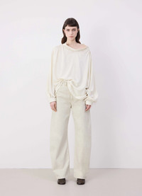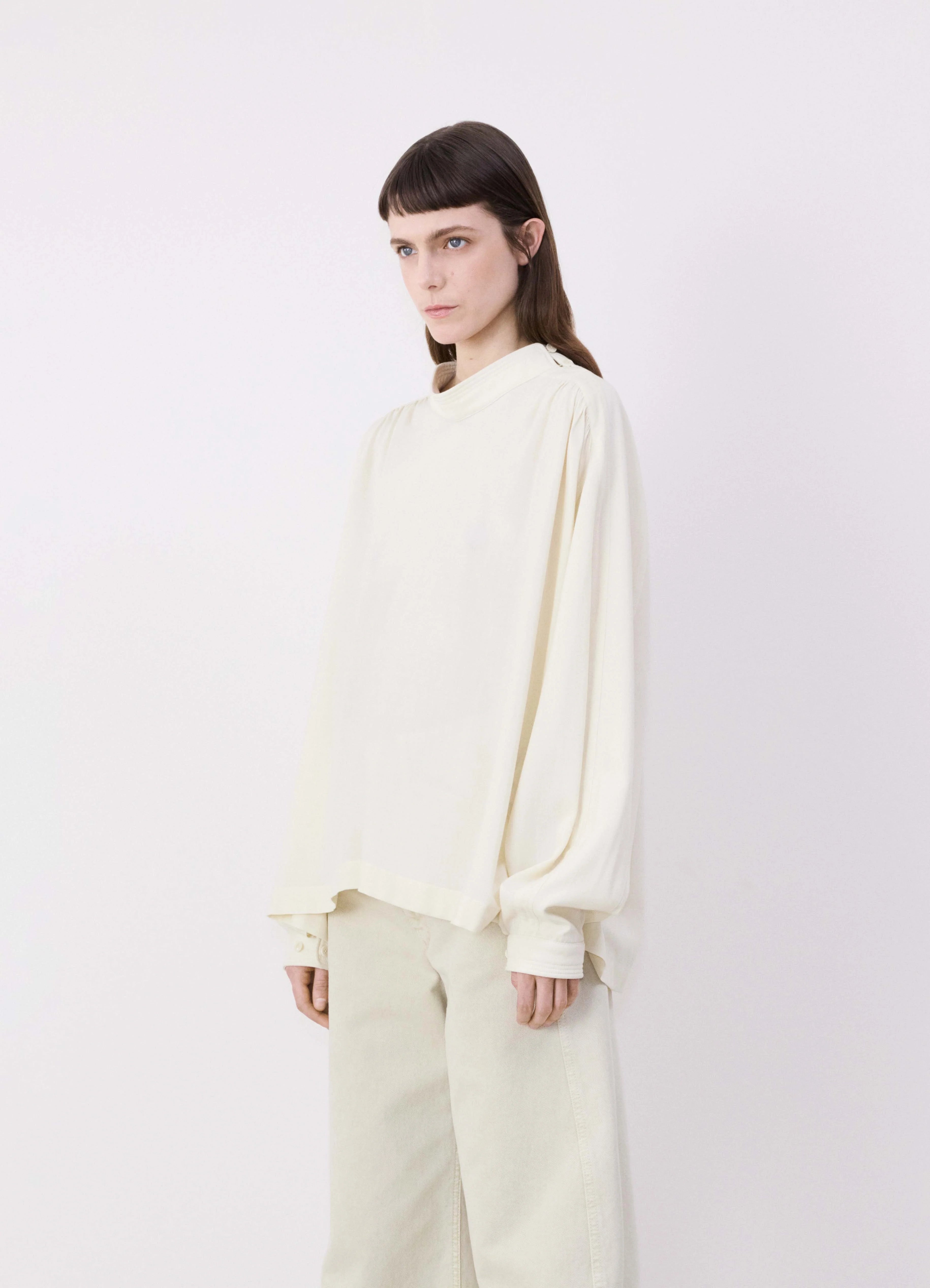 The Housse Top is crafted in a light blend of viscose and wool with a warm and soft hand. The yoke, collar and cuffs are lined in cotton for added structure and comfort. Inspired by a painter's smock, this blouse features topstitching details through the shoulders and around the neck, where corozo buttons help open the garment to put it on. There is a feminine rushing effect at the top of the front yoke and the voluminous, flowy sleeves feature adjustable cuffs with slits. DETAILS - Relaxed fit - Coton lined - Corozo buttons - Gathered detailing - Contrast topstitching detailing Made in Romania Style: TO1305 LF1286 FABRICS & CARE Main Fabric: 85% Viscose / 15% Virgin Wool Main Lining: 100% Cotton Trims: 100% Polyester Do not wash Do not bleach Do not tumble dry Cool ironing Soft dry clean