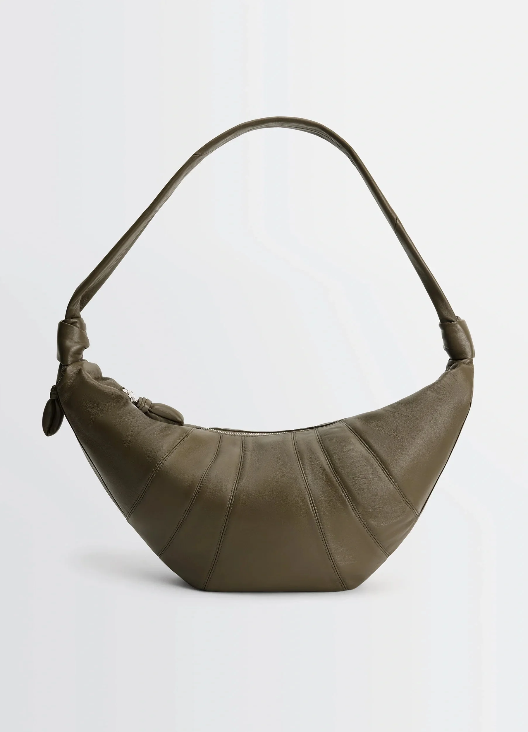The Croissant line is emblematic of the Lemaire wardrobe. This versatile, supple bag features a curve inspired by the Viennoiserie of the same name, created by a combination of topstitched panels and knotted elements. The large bag is crafted in nappa lamb leather, a soft, supple material characterized by its smooth hand and natural shine, certified LWG Gold. DETAILS Large Croissant bag in nappa lambskin leather Soft model with stitched panels Hand, shoulder, and crossbody carry Strap with knot-style details Zipped side pocket with quilted pull tab Zipper closure with quilted pull tab Cotton canvas lining and inside card pocket Lemaire embossed interior leather label Inside zipped pouch in coated cotton, removable with snap tab and ring Silver-plated metalwork Dimensions: Length: 60 cm Height: 28 cm Depth: 17 cm Arrow height: 30 cm Strap length: 86 cm Made in Spain Style : BG0000 LL095 FABRICS & CARE Main material: 100% lamb Main lining: 100% cotton