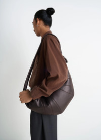 This classic LEMAIRE bag, the largest of the Croissant bag family, is made of smooth nappa leather with a soft touch. Inspired by the shape of a croissant pastry, the bag's design is achieved through an assembly of topstitched cutouts. Its ergonomic shape wraps around the body for an easy, casual wear. It features a matching looped zip puller, side knot finishings, a side zipped pocket and a removable A5 pouch. It can be worn as a shoulder or crossbody bag. DETAILS Cotton canvas lining Metal zip Removable A5 pouch Made in Spain Style : BG0000 LL095 FABRICS & CARE Main Fabric : 100% Lamb Main Lining : 100% Coton Do not wash Do not bleach Do not tumble dry Do not iron Professional leather clean only