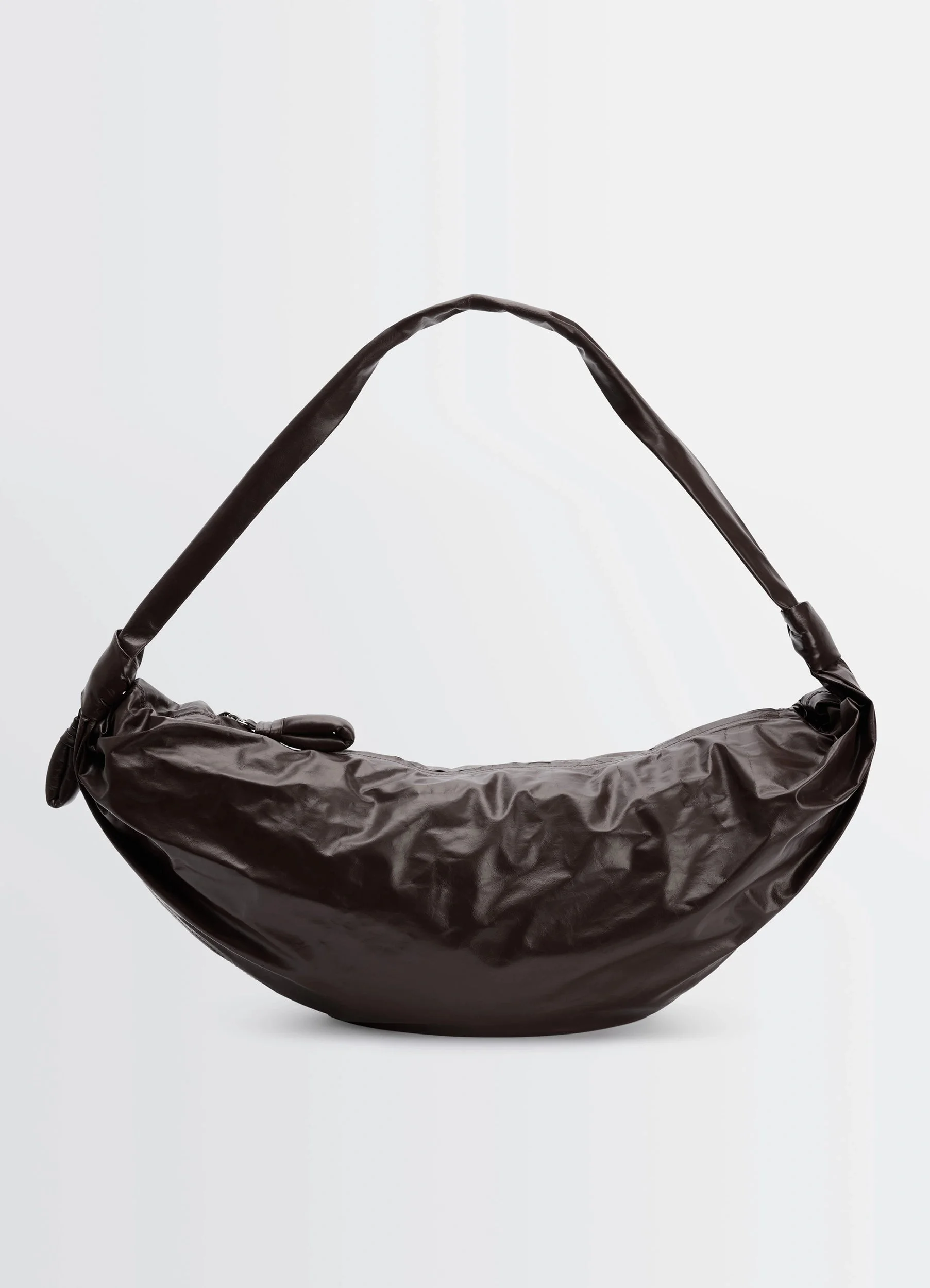 Now part of the iconic Croissant family, this Large Soft Croissant is made of leather that is lightweight yet resistant with a slightly shiny finish, mimicking the texture of paper for a distinctive tactile experience. This version keeps the main signatures of the Croissant, the wadded pullers and the side knot finishings. Its body is draped from below the knotted strap, creating gathers on either side. This style features a lateral zipped pocket as well as an interior zip patch pocket and an interior patch pocket. It has the capacity for accessories such as a smartphone, a wallet, a 4x7-inch book or a 13-inch laptop computer. Worn as a shoulder or cross-body bag, its ergonomic shape wraps around the body for an easy, casual wear. DETAILS - This bag can be worn on the shoulder or cross-body - Height of the shoulder strap: 40cm / 16in - Length: 68cm / 26,7in - Width: 30cm / 12in - Depth: 10cm / 4in - Lining in cotton canvas - Metal Looped zip puller - Interior zip patch pocket (can contain small accessories: card holder or Airpods Pro 2 case) - Interior patch pocket (can contain small accessories: keys or wallet) - Lateral zipped pocket (can contain accessories: smartphone) - Main compartment (can contain accessories: 4x7-inch book, 13-inch laptop) - Side knot finishings - Embossed logo inside Made in Tunisia Style: BG0027 LL0028 FABRICS & CARE Main Material : 100% Cow Main Lining : 100% Cotton