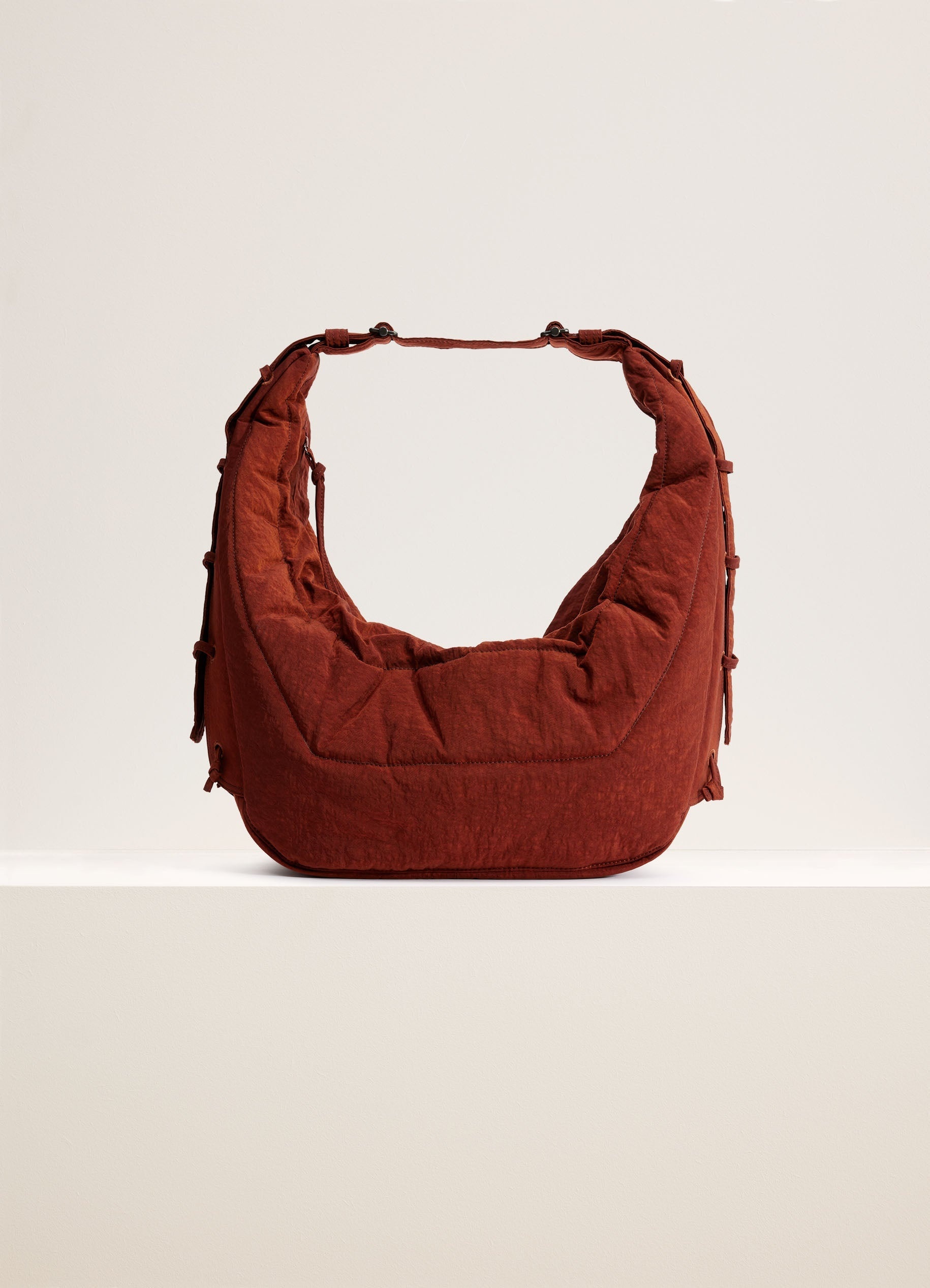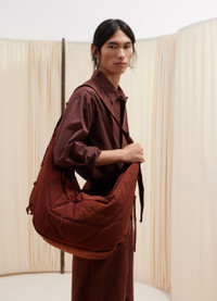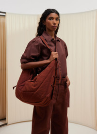 This unisex bag is the largest size of the Soft Game family. It is made of a slightly fluffy-nylon canvas treated with a water-repellent finish. This wadded fabric gives the bag a matte surface and a sturdy structure that holds its shape over time. Inspired by the Croissant bag, the Large Soft Game is lightweight yet functional thanks to its padded adjustable strap and its interior zipped pocket. It has the capacity for accessories such as a smartphone, a 4x7-inch book or a 13-inch laptop computer. On both sides of the bag, embroidered eyelets and laces allow its volume to be adapted. Ideal for daily use, the Large Soft Game can be worn as a shoulder or a cross-body bag. DETAILS - This bag can be worn on the shoulder or cross-body - Height of the shoulder strap: 60 cm / 24-inch - Length: 75 cm / 30-inch - Width: 32,5 cm / 12,8-inch - Depth: 17 cm / 6,7-inch - Lining in nylon - Adjustable nylon strap with metal buckle - Zipped opening with puller from the same fabric - Interior zipped patch pocket (can contain small accessories: smartphone, wallet, card holder or Airpods Pro 2 case) - Main compartment (can contain accessories: 4x7-inch book, 13-inch laptop computer) - Garment dyed - Water-repellent finishes keep rain and splashes out, but are not waterproof Made in Italy Style: BG0074 LF845 FABRICS & CARE Main Material: 100% Polyamide Main Lining: 100% Polyamide Do not wash Do not bleach Do not tumble dry Do not iron Professional cleaner only