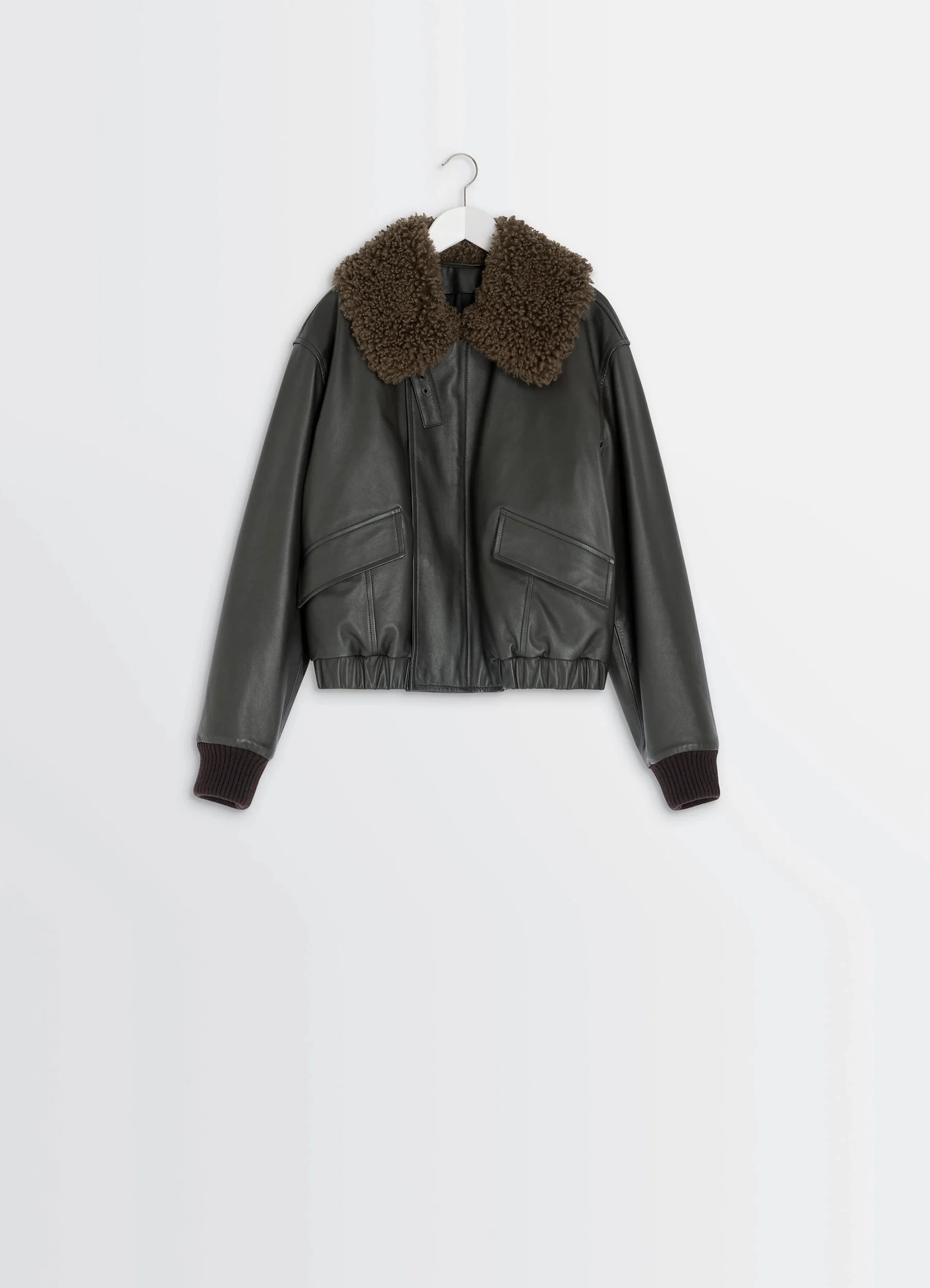 This blouson is part of the LEMAIRE family of garments crafted in leather. It is made of leather that is sturdy, with a sleek shine. Its shape is inspired by classic flight jackets, with a rounded shape emphasized by interior padding, pleated darts on the back and an elasticated hem. It has a convertible tonal shearling collar with a leather strap and buckle to close it, a concealed zipper placket with snap buttons, and two large flap pockets. DETAILS - Relaxed fit - Fully lined - Ribbed cuffs - Interior patch pocket - Snap buttons Made in Turkey Style: OW1043 LL0095 FABRICS & CARE Main Fabric: 100% Cow Second Fabric: 100% Lamb Main Lining: 51% Cotton / 49% Viscose Second Lining: 100% Cotton Trims: 95% Polyester / 5% Polyamide/Nylon Do not wash Do not bleach Do not tumble dry Do not iron Professional leather clean only