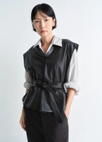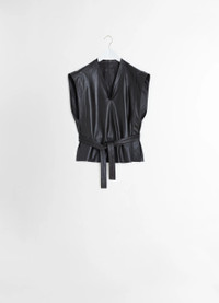This chasuble returns the LEMAIRE wardrobe this season in a new material. It is crafted in a light lamb leather with a soft hand and comes unlined. Ideal for layering, the Leather Chasuble features a V-neck with binding. An applied band around the arm hole becomes a slit from the waist down, facilitating movement. On the back, a removable belt with central stitching and pointed waistband allows the garment to be tightened. DETAILS - Boxy fit - Cropped cut - V-neck - Removable belt - Side slits Made in Turkey Style: TO1383 LL0133 FABRICS & CARE Main Fabric: 100% Cotton Do not wash Do not bleach Do not tumble dry Do not iron Professional leather clean only