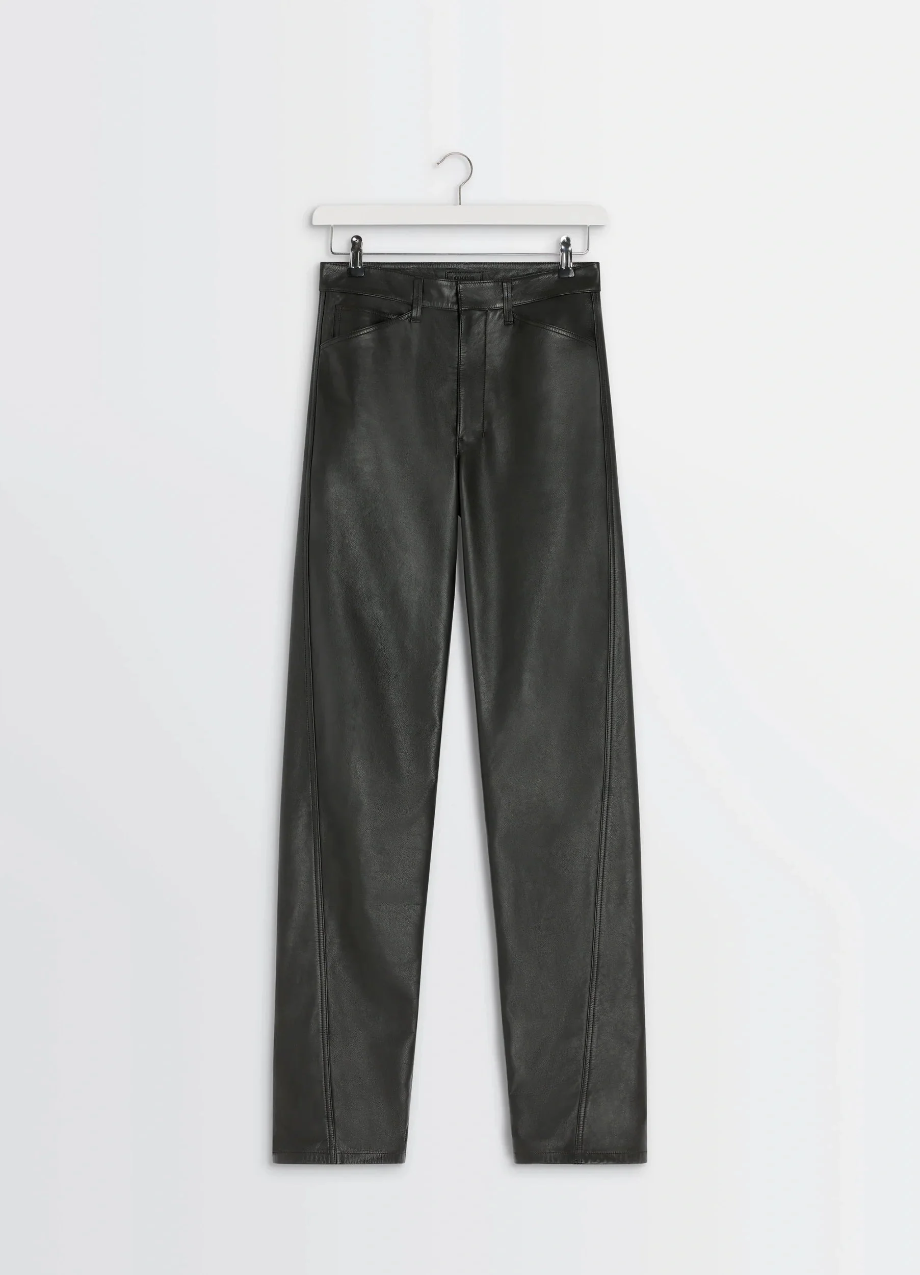 These Twisted five-pocket pants are a classic in the Lemaire wardrobe, with seams giving a rounded shape to the leg. It is made from nappa cow leather, a soft, supple material characterized by its smooth feel and natural sheen. The model is 177 cm and is wearing a size 36 (S). These Twisted five-pocket pants are a classic in the Lemaire wardrobe, with seams giving a rounded shape to the leg. It is made from nappa cow leather, a soft, supple material characterized by its smooth feel and natural sheen. The model is 177 cm and is wearing a size 36 (S). DETAILS Nappa cow leather five-pocket Twisted pants Straight cut Fully lined model Belt loops at the waistband Closure with hook, button, and hidden zipper Five pockets Twisted seams Back patch pockets Made in Turkey Style : PA1256 LL0095 Nappa cow leather five-pocket Twisted pants Straight cut Fully lined model Belt loops at the waistband Closure with hook, button, and hidden zipper Five pockets Twisted seams Back patch pockets Made in Turkey Style : PA1256 LL0095 CARE Main Material: 100% Cow Leather Main Lining: 100% Cotton Second Lining: 63% Viscose 37% Cotton Do not wash Do not bleach Do not tumble dry Do not iron Professional leather clean only Main Material: 100% Cow Leather Main Lining: 100% Cotton Second Lining: 63% Viscose 37% Cotton Do not wash Do not bleach Do not tumble dry Do not iron Professional leather clean only