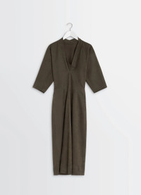 Inspired by Lemaire's taste for the link between comfort and elegance, this V-neck dress in lightweight nubuck leather completes the house's feminine wardrobe. The model is 177 cm tall and is wearing a size 36 (S). DETAILS Light nubuck leather V-neck dress Fitted cut Midi-length Draped V-neck panel Three-quarter sleeves Invisible side zipper closure Made in Turkey Style : DR1122 LL0148 CARE Main Material: 100% Cow Leather Do not wash Do not bleach Do not tumble dry Do not iron Professional leather clean only
