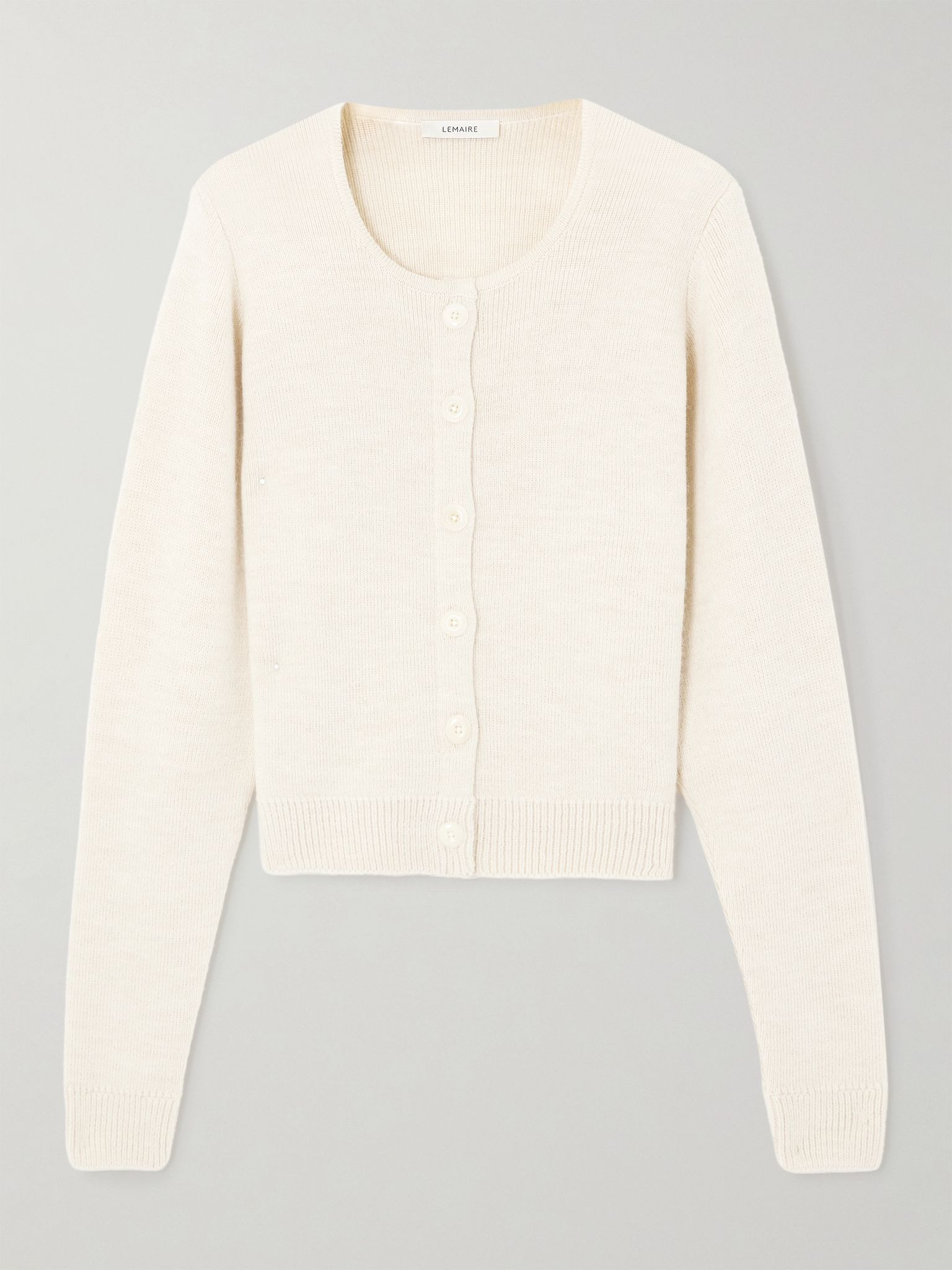 Lemaire's cardigan is a cozy staple you'll reach for often. It's knitted with touches of alpaca and wool for added softness and fastens with a neat row of tonal buttons. Wear yours solo or underpinned with a turtleneck. Size & Fit - Fits true to size, take your normal size - Designed for a relaxed fit - Long in the sleeves - Mid-weight knit - Model is 177cm/ 5'10" and is wearing a size Small Model measurements: - Bust: 85cm/ 33.5" - Waist: 65cm/ 25.5" - Hip: 91cm/ 36" Details & Care - Off-white acrylic-blend - Button fastenings through front - 45% acrylic, 40% alpaca, 15% wool - Dry clean
