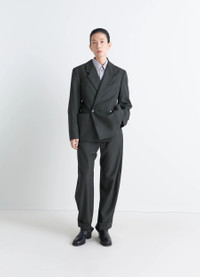 This double-breasted tailored jacket is made from a light tropical wool-blend suiting fabric, characterized by its mottled appearance and dense and supple hand. This piece is a desire to deconstruct the garment and reinterpret the world of traditional tailoring to represent Lemaire's approach to singular elegance. The model is 177 cm and is wearing a size 36 (S). This double-breasted tailored jacket is made from a light tropical wool-blend suiting fabric, characterized by its mottled appearance and dense and supple hand. This piece is a desire to deconstruct the garment and reinterpret the world of traditional tailoring to represent Lemaire's approach to singular elegance. The model is 177 cm and is wearing a size 36 (S). DETAILS Double-breasted suit jacket in tropical wool blend Oversized cut Fully lined model Tailored collar with buttonhole and under-button collar Structured shoulders with slim shoulder pads Long sleeves Patch side pockets Double-breasted button closure Welted inside pockets, including one buttoned Made in Portugal Style : JA1085 LF414 Double-breasted suit jacket in tropical wool blend Oversized cut Fully lined model Tailored collar with buttonhole and under-button collar Structured shoulders with slim shoulder pads Long sleeves Patch side pockets Double-breasted button closure Welted inside pockets, including one buttoned Made in Portugal Style : JA1085 LF414 CARE Main Material: 55% Polyester 45% Wool Main Lining: 51% Cotton 49% Viscose Second Lining: 100% Cotton Do not wash Do not bleach Do not tumble dry Cool ironing Soft dry clean Main Material: 55% Polyester 45% Wool Main Lining: 51% Cotton 49% Viscose Second Lining: 100% Cotton Do not wash Do not bleach Do not tumble dry Cool ironing Soft dry clean