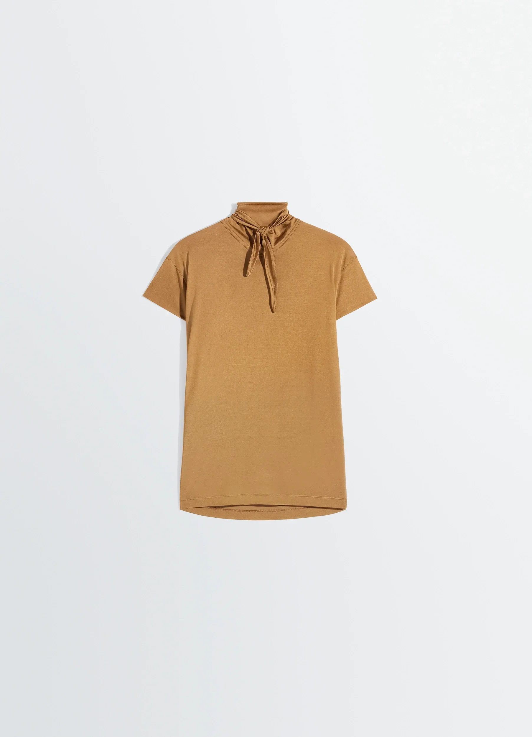 This short-sleeved T-shirt is an essential piece of the LEMAIRE wardrobe. It is made of cotton jersey with a scarf collar. The model is 177 cm tall and wears a size 36 (S). This short-sleeved T-shirt is an essential piece of the LEMAIRE wardrobe. It is made of cotton jersey with a scarf collar. The model is 177 cm tall and wears a size 36 (S). DETAILS Short-sleeved scarf top in viscose-cotton jersey Fitted cut Neckline with integrated scarf to tie or wear loose Short sleeves Made in Portugal Style: TS0020 LJ1049 Short-sleeved scarf top in viscose-cotton jersey Fitted cut Neckline with integrated scarf to tie or wear loose Short sleeves Made in Portugal Style: TS0020 LJ1049 CARE Main fabric: 52% viscose, 48% cotton Main lining: 100% cotton Hand wash Do not bleach Do not tumble dry Cool ironing Do not dry clean Dry flat Wash and iron upside down Main fabric: 52% viscose, 48% cotton Main lining: 100% cotton Hand wash Do not bleach Do not tumble dry Cool ironing Do not dry clean Dry flat Wash and iron upside down