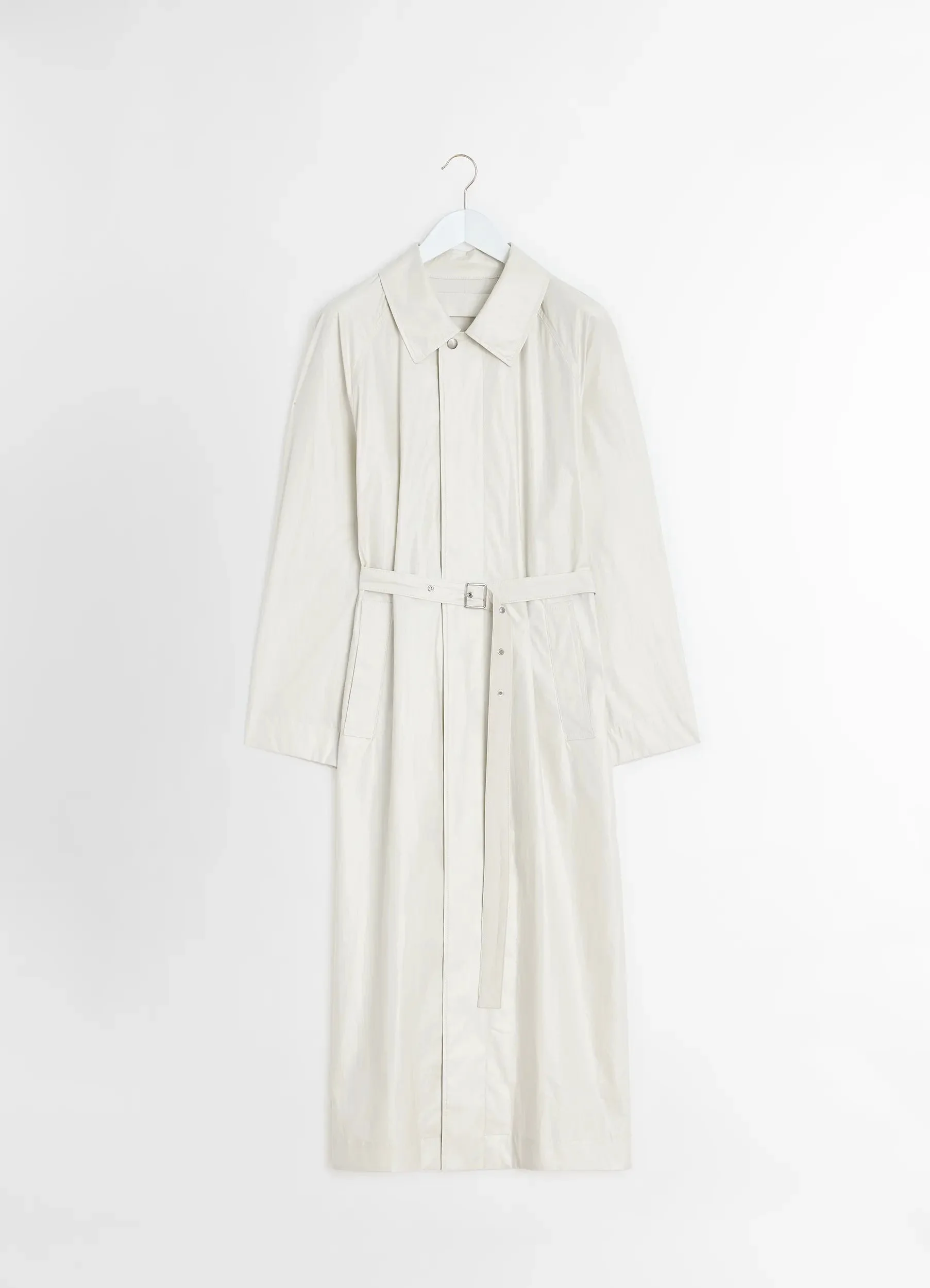 This Light Belted Coat is crafted in light coated cotton with a water repelling coating, giving it a wet and shiny aspect. The removable belt is adjustable with two adjustable loops that can be positioned according to the desired waist height. Inside, this coat features a strap to carry it like a bag, over the shoulder or across the body for more convenience, in keeping with LEMAIRE's nomadic spirit. DETAILS Straight fit High waisted belt Metal snap buttons Slitted in the back Unlined Made in Ukraine Style: CO1103 LF1381 The Model is 177cm / 5'9½'' ft and is wearing a size 36 (S). FABRICS & CARE Main Fabric: 100% Cotton Main Lining: 100% Cotton Do not wash Do not bleach Do not tumble dry Cool ironing Soft dry clean Discover the traceability