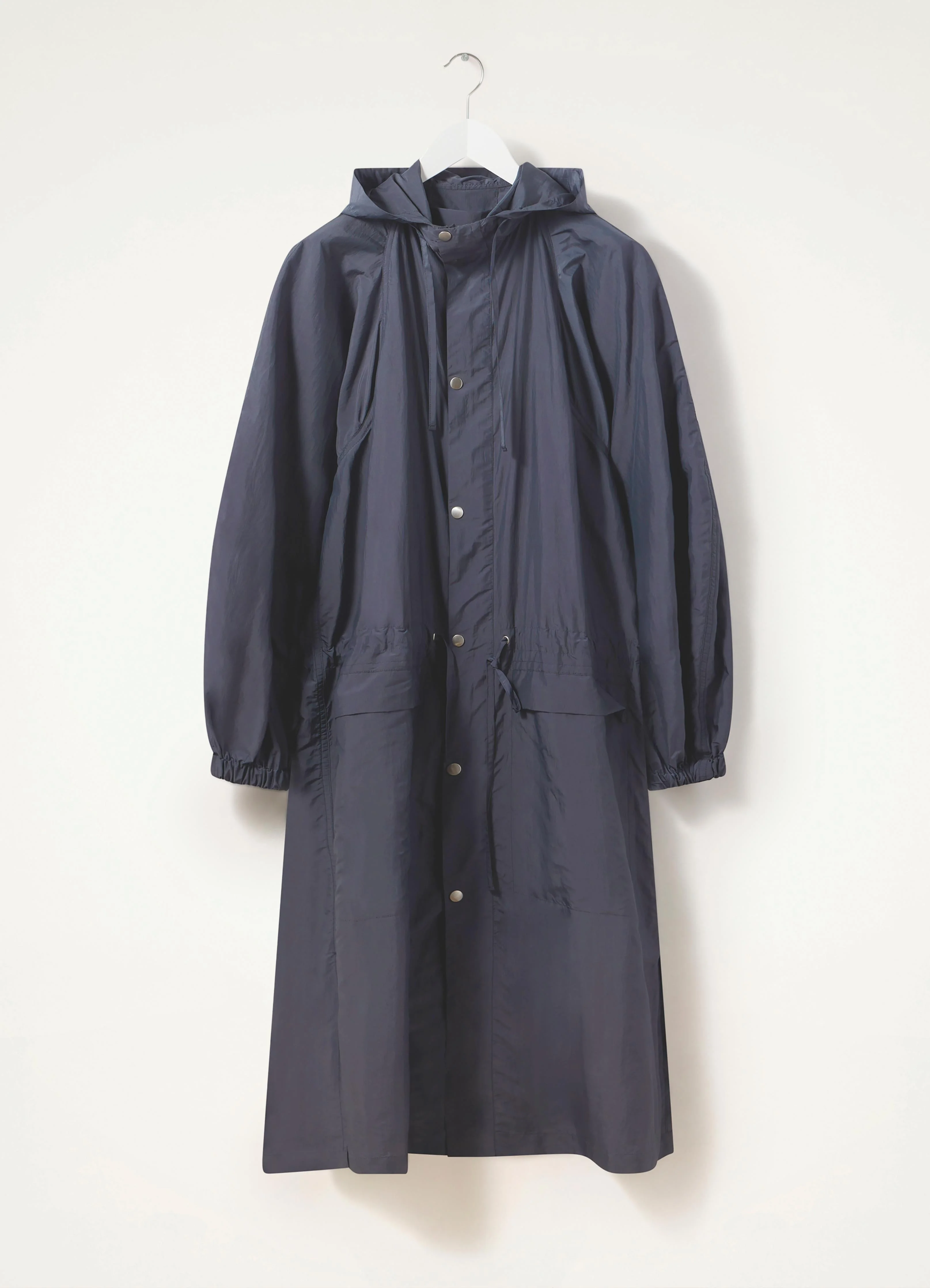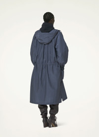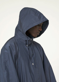 This raincoat is made of an ultra-light silk blend that is slightly transparent, with a technical, water-repellent finish. It has a straight, relaxed fit with a box pleat in the back, and can be adjusted with an interior drawstring around the waist. Its practical details include a drawstring hood and two large rain-proof flap pockets below the waist. DETAILS Loose fit Metal snap buttons Raglan sleeves Elasticated cuffs Side vents Interior patch pocket Water-repellent Made in France Style : CO1029 LF1109 This model is 180 cm and is wearing a size 36/S FABRICS & CARE Main Fabric : 50% Silk, 50% Polyamide/Nylon Do not wash Do not bleach Do not tumble dry Cool ironing Soft dry clean