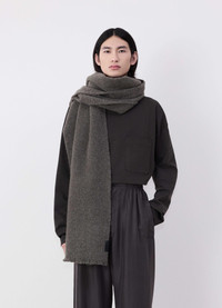 The maxi Fluffy Scarf complements the everyday LEMAIRE vestiaire. It is crafted in fine and fluffy alpaca wool with a soft touch. It is comfortable and large enough to be styled in various ways. The signature LEMAIRE-embossed soft leather patch is sewn at the hem for a luxurious finish, and it has a short fringe at the hem. DETAILS - Unisex - 220cm X 53cm / 86,6in X 20,8in - 2cm / 0,8in fringe - Leather patch with logo Made in Italy Style: AC1185 LF1194 FABRICS & CARE Main Fabric: 80% Alpaga / 20% Polymide / Nylon Hand wash Do not bleach Do not tumble dry Cool ironing Soft dry clean Dry flat