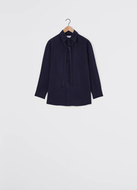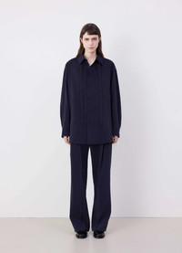 This shirt is a staple of LEMAIRE’s wardrobe. It is made of dry silk, a classic Lemaire fabric with a soft hand and tonic texture. It has a classic, relaxed silhouette with a pointed collar and a long neck-tie that can be buttoned and tied in various ways. It opens halfway down the front with a french placket, and is constructed with a pleated yoke in the back. DETAILS - Loose fit - Removable neck tie - Adjustable buttoned cuffs - Rounded hem - Topstitching - Mother-of-pearl buttons Made in Romania Style: SH1051 LF1308 FABRICS & CARE Main Fabric: 76% Silk / 24% Polyamide/Nylon Do not wash Do not bleach Do not tumble dry Cool ironing Soft dry clean