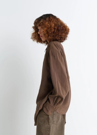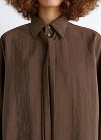 This long, oversized shirt is inspired by Lemaire's love for movement and features a necktie-style tie that can be tied or left loose. It is crafted in a dry silk blend, a classic house fabric with a soft hand and slightly crinkled texture.The model is 177 cm and is wearing a size 36 (S). DETAILS Long shirt with tie in a dry silk blend Oversized cut Shirt collar Buttoned tie at the collar stand Front button closure Long sleeves Straight buttoned cuffs Mother-of-pearl buttons Made in Romania Style : SH1051 LF1308 FABRICS & CARE Main Material: 76% Silk 24% Polyamide