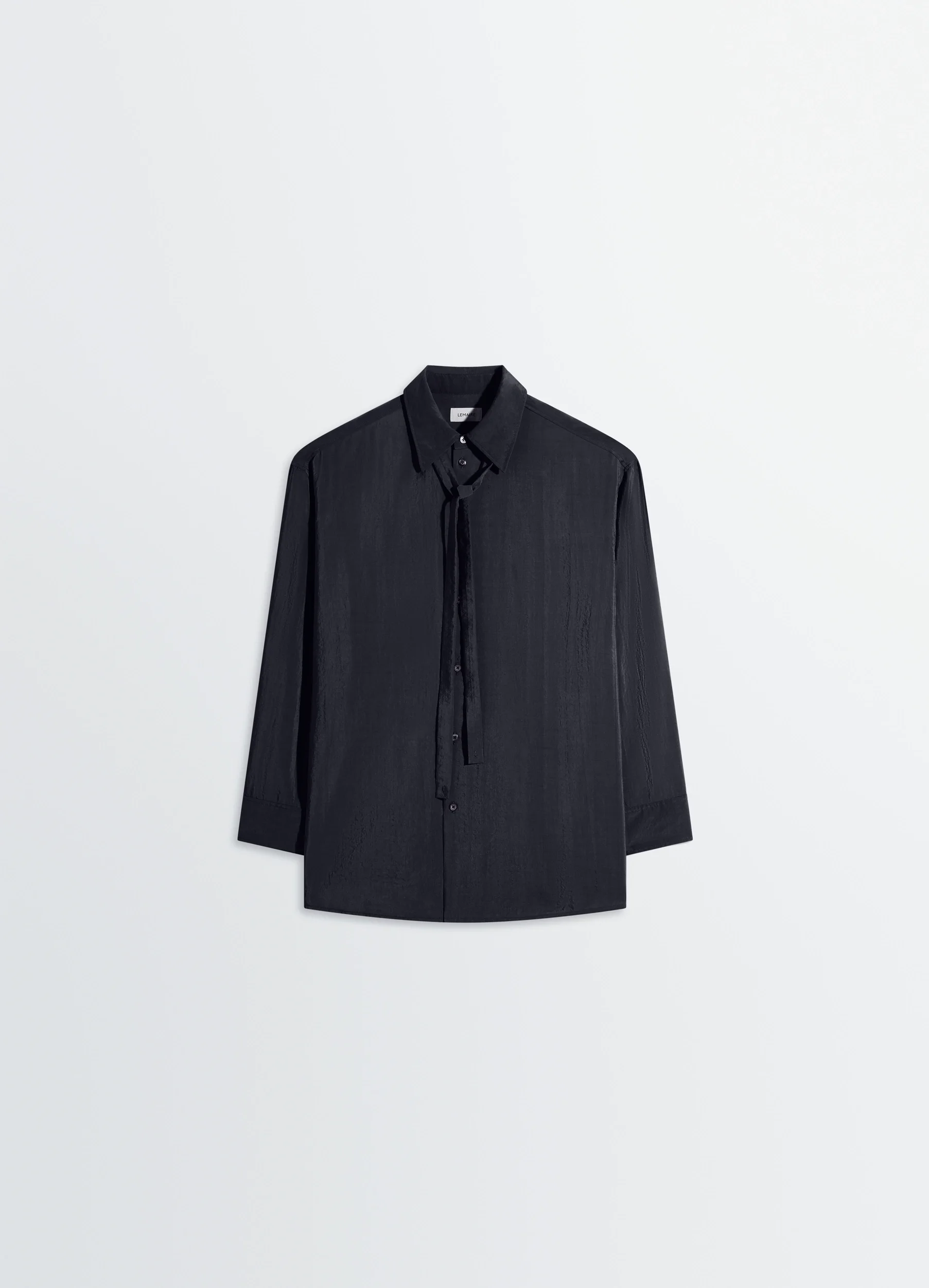 This long, oversized shirt is inspired by Lemaire's love for movement and features a necktie-style tie that can be tied or left loose. It is crafted in a dry silk blend, a classic house fabric with a soft hand and slightly crinkled texture. The model is 177 cm and is wearing a size 36 (S). This long, oversized shirt is inspired by Lemaire's love for movement and features a necktie-style tie that can be tied or left loose. It is crafted in a dry silk blend, a classic house fabric with a soft hand and slightly crinkled texture. The model is 177 cm and is wearing a size 36 (S). DETAILS Long shirt with tie in a dry silk blend Oversized cut Shirt collar Buttoned tie at the collar stand Front button closure Long sleeves Straight buttoned cuffs Mother-of-pearl buttons Made in Romania Style : SH1282 LF1308 Long shirt with tie in a dry silk blend Oversized cut Shirt collar Buttoned tie at the collar stand Front button closure Long sleeves Straight buttoned cuffs Mother-of-pearl buttons Made in Romania Style : SH1282 LF1308 CARE Main Material: 76% Silk, 24% Polyamide Soft wash 30° Do not bleach Do not tumble dry Cool ironing Soft dry clean Main Material: 76% Silk, 24% Polyamide Soft wash 30° Do not bleach Do not tumble dry Cool ironing Soft dry clean