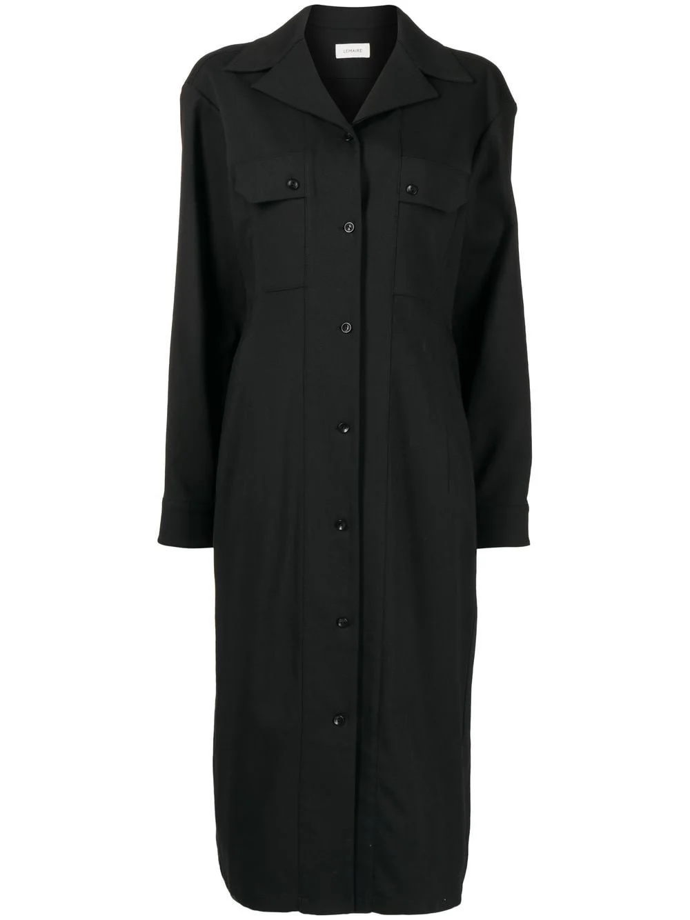 long-sleeve shirt dress jet black notched collar front button fastening long sleeves buttoned cuffs two chest flap pockets straight hem Imported Composition Cotton 45%, Viscose 33%, Wool 22% SIZE & FIT Model measurements Height 5 ft 11 in(1.8 m) Bust/Chest 28.34 in(72 cm) Hips 35.43 in(90 cm) Waist 23.62 in(60 cm) FittingInformation This piece fits true to size. We recommend you get your regular size Designed for a loose fit with a close fit at the waist Made with a mid-weight non-stretch fabric