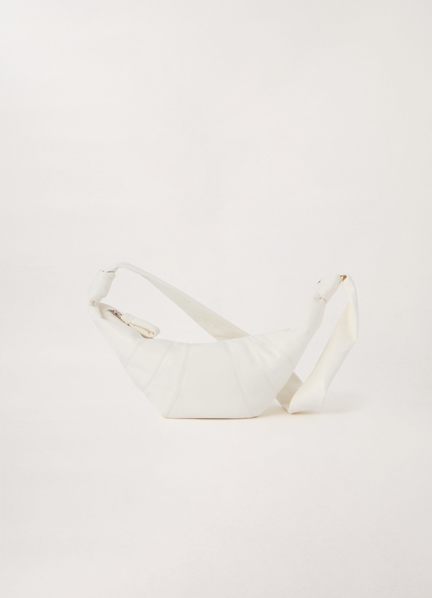 This classic LEMAIRE bag is made of smooth nappa leather with a soft touch. Inspired by the shape of a croissant pastry, the bag's design is achieved through an assembly of topstitched cutouts. It features a matching looped zip puller and side knot finishings, and is worn as a shoulder or crossbody bag. DETAILS Cotton canvas lining Metal zip Length 22 cm Width 47 cm Depth 7 cm Made in Spain Style : BG291 LL095 FABRICS & CARE Main Material: 100% Lambskin Main Lining: 100% Cotton Do not wash Do not bleach Do not tumble dry Do not iron Professional leather clean only