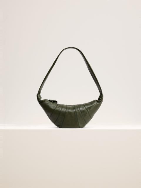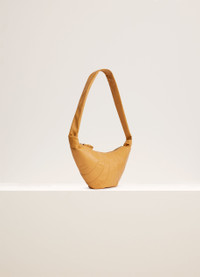 This classic LEMAIRE bag is part of the iconic Croissant family. It is made of soft lamb nappa leather that is supple yet resistant. Its smooth surface adds a tactile element and contributes to the durability of the bag’s curve. Inspired by the shape of the croissant pastry, its design is achieved through an assembly of top-stitched cutouts, blending style and functionality. It also features a matching looped zip puller and side knot finishings. The Medium Croissant has the capacity for accessories such as a smartphone or 4x7-inch book. It can be worn as a shoulder or cross-body bag, expressing its versatility. DETAILS - This bag can be worn on the shoulder or cross-body - Height of the shoulder strap: 42 cm / 16,5 in - Lining in cotton canvas - Metal Looped zip puller - Interior patch pocket (can contain card holder, Airpods Pro 2 case, keys or wallet) - Main compartment (can contain accessories, smartphone or 4x7-inch book) - Side knot finishings - Embossed logo inside - Length: 22 cm / 9 in - Width: 47 cm / 19 in - Depth: 7 cm / 3 in - Made in Spain - Style: BG0001 LL095 FABRICS & CARE - Main Material: 100% Lamb - Main Lining: 100% Cotton - Do not wash - Do not bleach - Do not tumble dry - Do not iron - Professional leather clean onl