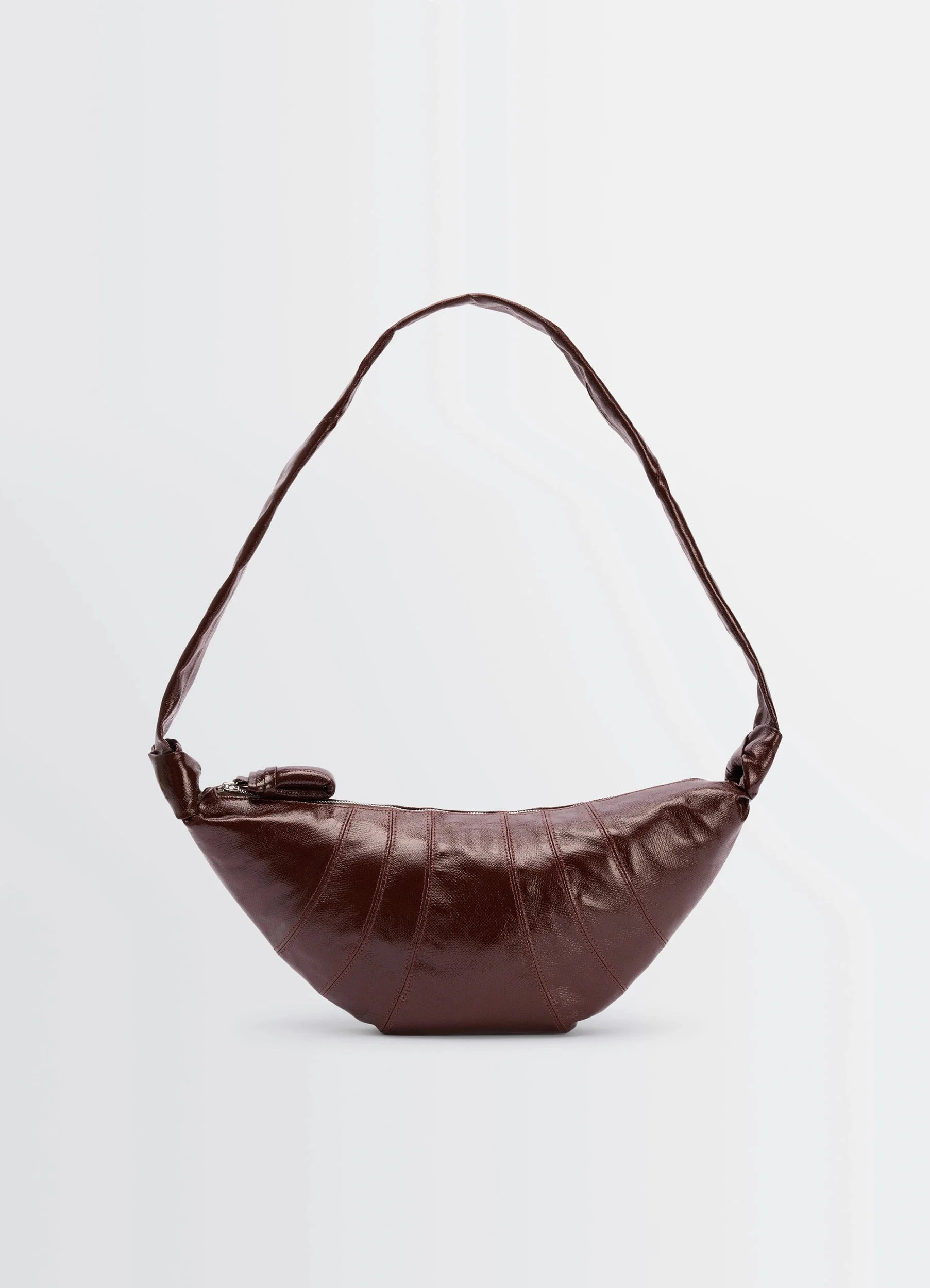This classic LEMAIRE bag is part of the iconic Croissant family. The Medium croissant is made of coated cotton with a crisp texture and a shiny finish, which was granted a GOT Certification. Its distinctive surface adds a tactile element and contributes to its durability. Inspired by the shape of the eponymous pastry, this vegan bag is achieved through an assembly of top-stitched cutouts, blending style and functionality. It features a matching looped zip puller and side knot finishings. It will host small accessories such as a smartphone, a card holder and a wallet, and can be worn over the shoulder or cross-body. DETAILS - This bag can be worn on the shoulder or cross-body - Height of the shoulder strap: 42cm / 16,5in - Length: 47cm / 19in - Width: 22cm / 9in - Depth: 7cm / 3in - Lining in cotton canvas - Metal Looped zip puller - Interior patch pocket (can contain card holder, Airpods Pro 2 case, keys or wallet) - Main compartment (can contain accessories, smartphone or 4x7-inch book) - Side knot finishings - Embossed logo inside Made in Spain Style: BG0001 LF1329