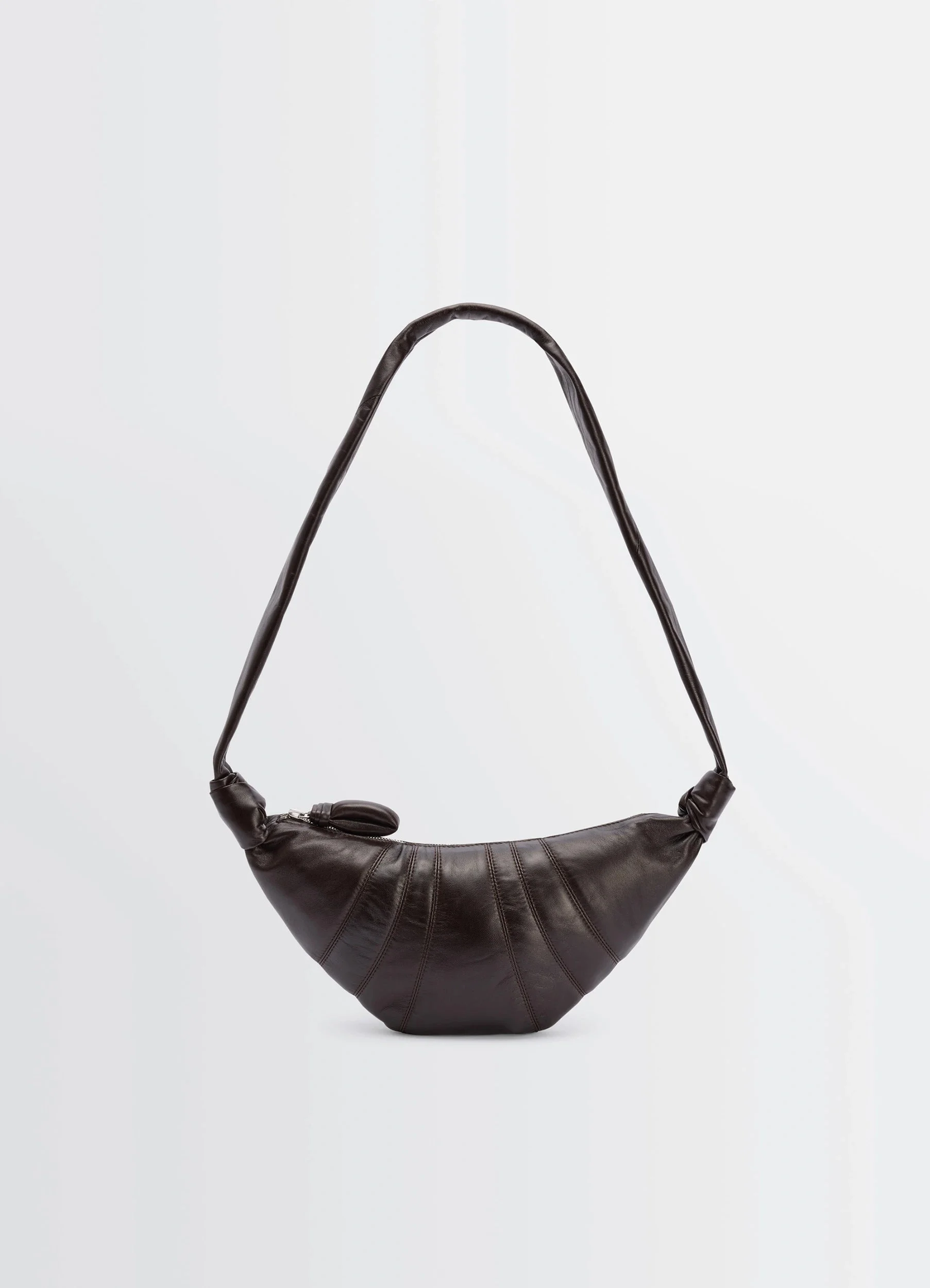 This classic LEMAIRE bag, the smallest of the Croissant family, is made of smooth nappa leather with a soft touch. Inspired by the shape of a croissant pastry, the bag's design is achieved through an assembly of topstitched cutouts. It features a matching looped zip puller, side knot finishings, as well as an inside pouch made of the same leather. The bag can be worn on the shoulder or as a crossbody bag. DETAILS Cotton canvas lining Metal zip Made in Spain Style : BG0003 LL095 FABRICS & CARE Main Fabric : 100% Lamb Main Lining : 100% Coton Do not wash
