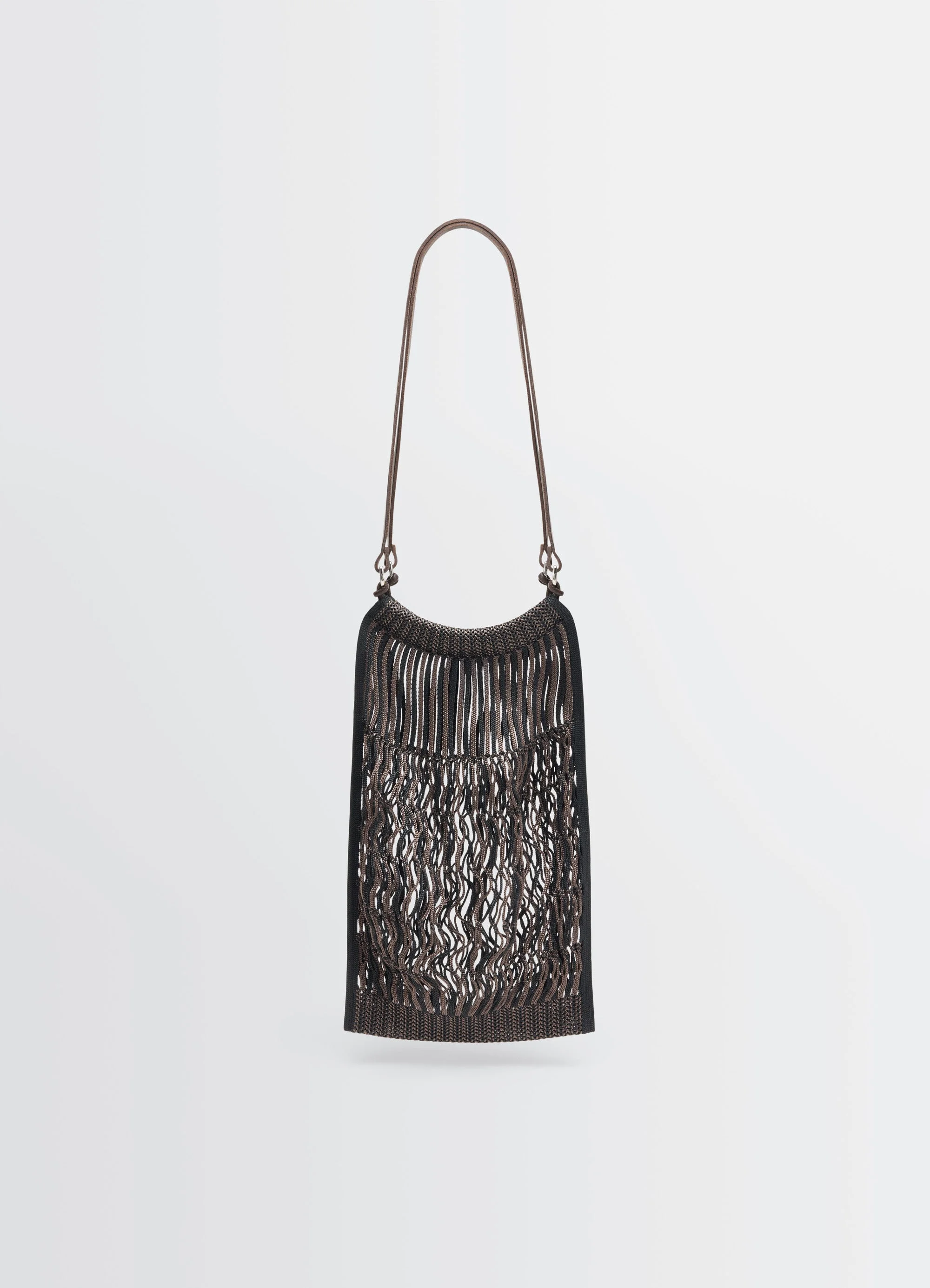 The result of a collaboration between Lemaire and Filt, the oldest French manufacturer of net shopping bags (established 1860), this bag is elegantly inspired by an everyday object. The medium shopping bag is made from a combination of nylon mesh and a vegetable-tanned leather shoulder strap, demonstrating Lemaire's commitment to craftsmanship. DETAILS Filt medium shopping bag in nylon net soft openwork model Hand and shoulder carry Tanned vegetable leather handles Side metal rings Interior labels including: Lemaire-embossed leather and Filt-logo woven label Silver-tone hardware Dimensions: Length: 21 cm Height: 36 cm Depth: 11 cm Arrow height: 30 cm Handle length: 60 cm Made in France Style : BG0076 LF1269 FABRICS & CARE Main Fabric: 100% Polyester Second Fabric: 100% Cow Main lining: 100% Polyamide/Nylon Do not wash Do not bleach Do not tumble dry Do not iron Professional leather clean only