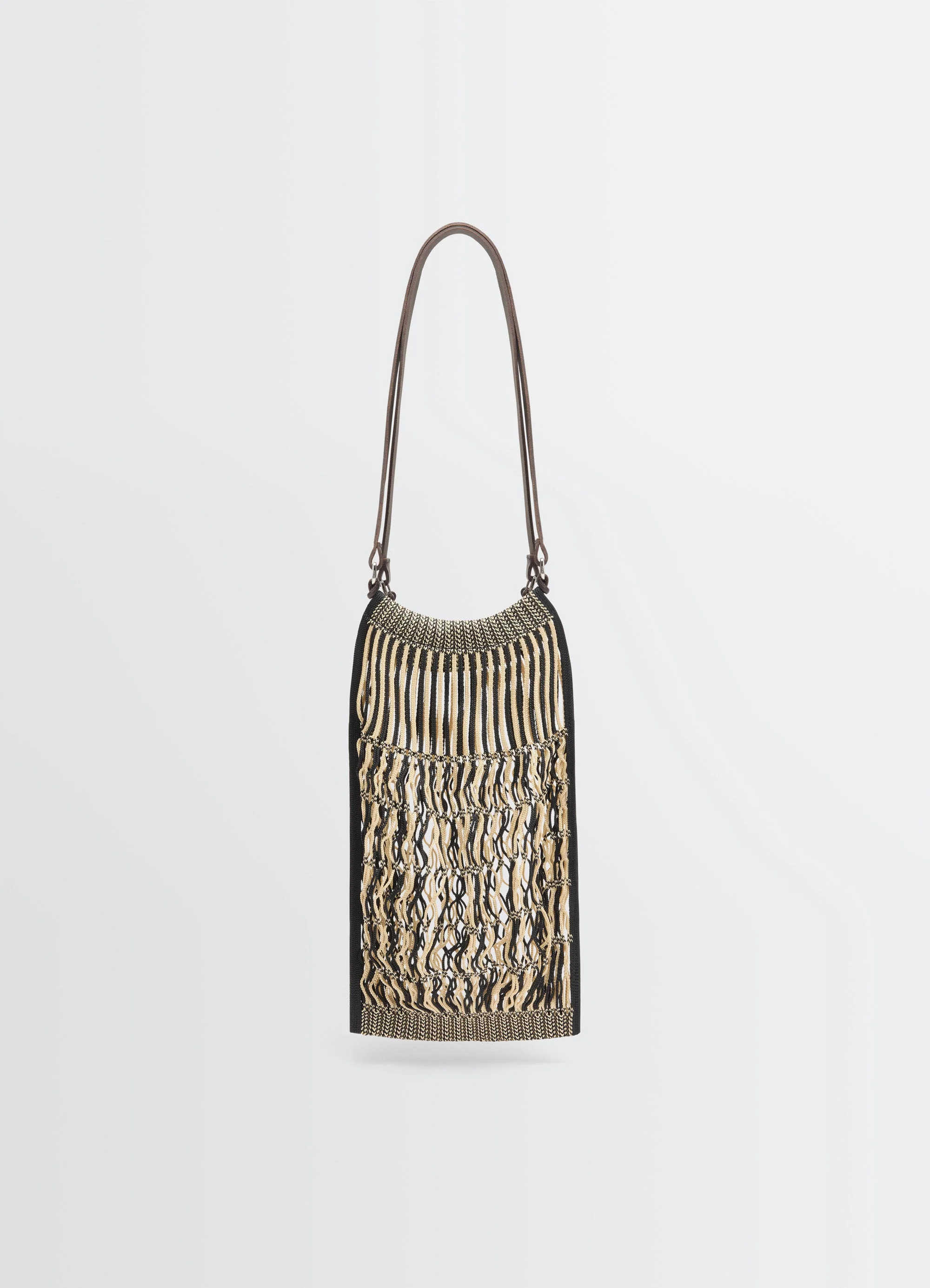 The result of a collaboration between Lemaire and Filt, the oldest French manufacturer of net shopping bags (established 1860), this bag is elegantly inspired by an everyday object. The medium shopping bag is made from a combination of nylon mesh and a vegetable-tanned leather shoulder strap, demonstrating Lemaire's commitment to craftsmanship. DETAILS Filt medium shopping bag in nylon net soft openwork model Hand and shoulder carry Tanned vegetable leather handles Side metal rings Interior labels including: Lemaire-embossed leather and Filt-logo woven label Silver-tone hardware Dimensions: Length: 21 cm Height: 36 cm Depth: 11 cm Arrow height: 30 cm Handle length: 60 cm Made in France Style : BG0076 LF1269 FABRICS & CARE Main Fabric: 100% Polyester Second Fabric: 100% Cow Main lining: 100% Polyamide/Nylon Do not wash Do not bleach Do not tumble dry Do not iron Professional leather clean only