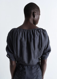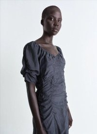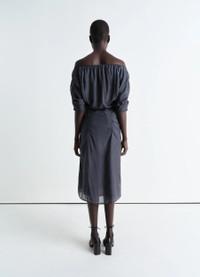 This Midi Dress reflects the dance-inspired theme dear to LEMAIRE this season. Drawing inspiration from the dresses worn by Pina Bausch, it is crafted from airy and light silk chiffon, with a soft touch, a subtle sheen and a slightly crinkled texture. A light cotton voile lining is attached at the neckline, making this piece incredibly comfortable to wear. Its design is detailed with tonal stitching and gathers that gently ruche the seams. The slightly plunging, elasticated neckline allows for an off-the-shoulder look if desired. The unlined elbow-length sleeves feature gathers, adding volume and movement to the silhouette. An invisible zipper ensures easy wear. DETAILS - Fitted cut - Midi length - U-shaped neck - Elasticated collar and shoulders - Gathers and stitching details - Invisible side zip - Cotton lining Made in Portugal Style: DR1098 LF1373 The Model is 180cm / 5'11" ft and is wearing a size 36 (S). CARE Main Fabric : 100% Silk Main Lining : 100% Cotton Do not wash Do not bleach Do not tumble dry Cool ironing Soft dry clean