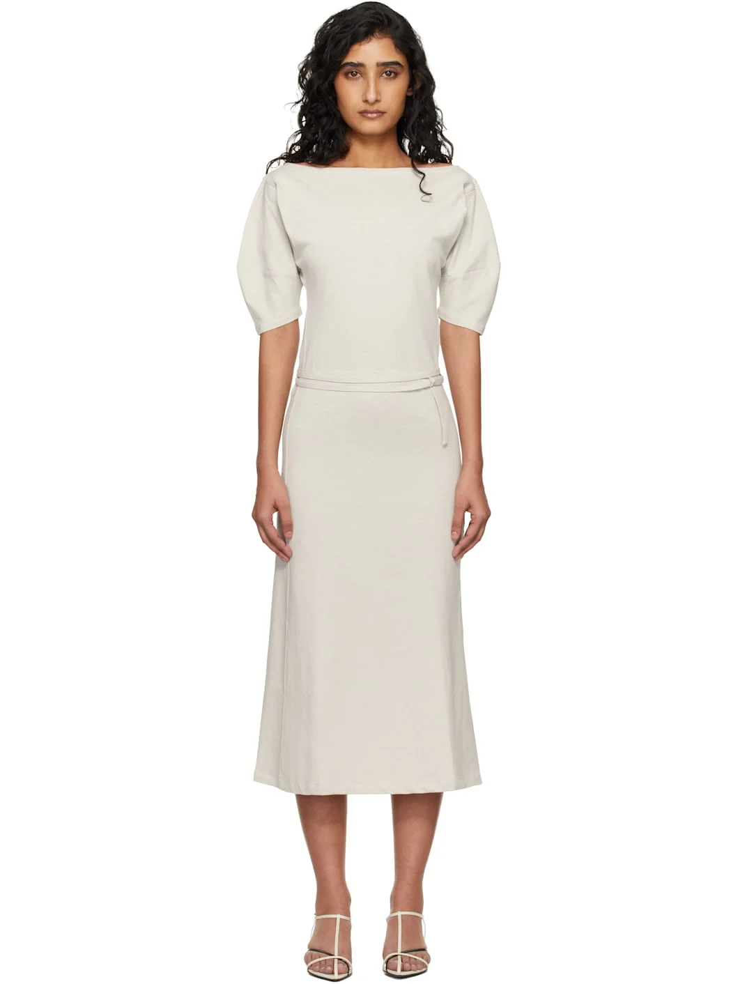 Cotton- and linen-blend jersey midi dress. · Off-the-shoulder construction · Boatneck · Detachable cinch belt at waist · Slit at side seam Supplier color: Pearl 70% cotton, 30% linen. Made in Portugal 261646F054011