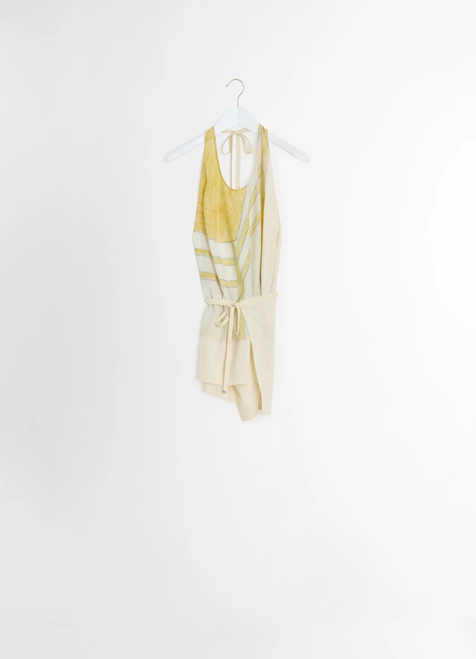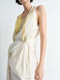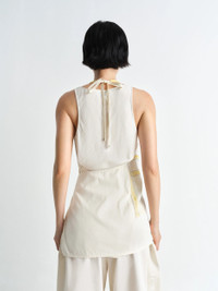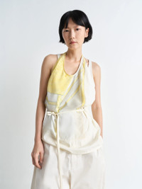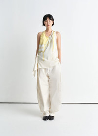 This top stems from the artistic dialogue between LEMAIRE and Philippe Weisbecker. It is crafted from printed viscose featuring the artist’s work, combined with lightweight technical lyocell, a lightweight yet structured material with a soft hand and a fresh feel on the skin. This backless design ties with two cords, each of which adorned with a shiny silver stud and an eyelet respectively. At the back, the top boasts two stitched pleats to maintain its structure and embrace the curves of the body. DETAILS - Straight cut - Philippe Weisbecker print - Backless - Two materials - Ties at the waist - Pleats at the back Made in Portugal Style: TO1379 LF1411 The Model is 176cm / 5' 9½'' ft and is wearing a size 36 (S). FABRICS & CARE Main Fabric: 100% Viscose Second Fabric: 69% Lyocell, 31% Polyamide/Nylon Do not wash Do not bleach Do not tumble dry Cool ironing Soft dry clean Discover the traceability