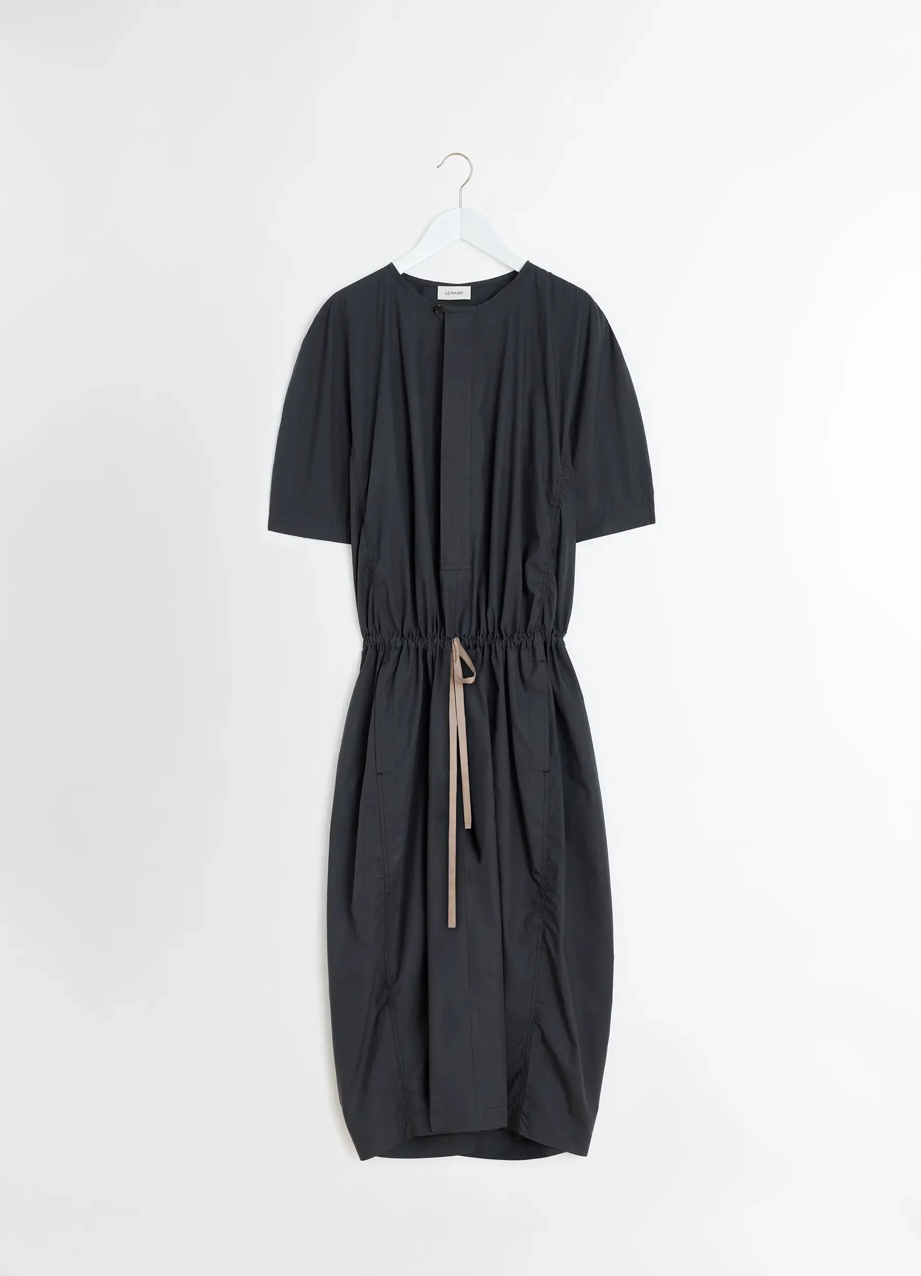 This dress is part of the Parachute family introduced this season in the LEMAIRE wardrobe. It is crafted from lightweight washed cotton poplin with a soft hand and a satin-like texture. This material has been washed, which adds a gentle movement to the garment. The round neckline fastens with an off-centered button to tie with a loop. This style features two seam pockets on the side and a hidden button placket extends down to the waist, which is cinched with a contrasting cotton tie for cinching. The sleeves are rounded, and the seams are slightly frayed, a signature detail of LEMAIRE. DETAILS - Relaxed fit - Midi length - Round neck - Contrasted tie to knot at the waist - Seam side pockets - Concealed buttoning placket Made in Portugal Style: DR1110 LF1364 The Model is 180cm / 5'11" ft and is wearing a size 36 (S). FABRICS & CARE Main Fabric: 100% Cotton Soft wash 30° Do not bleach Do not tumble dry Cool ironing Soft dry clean Discover the traceability