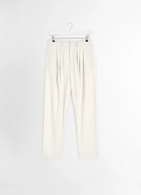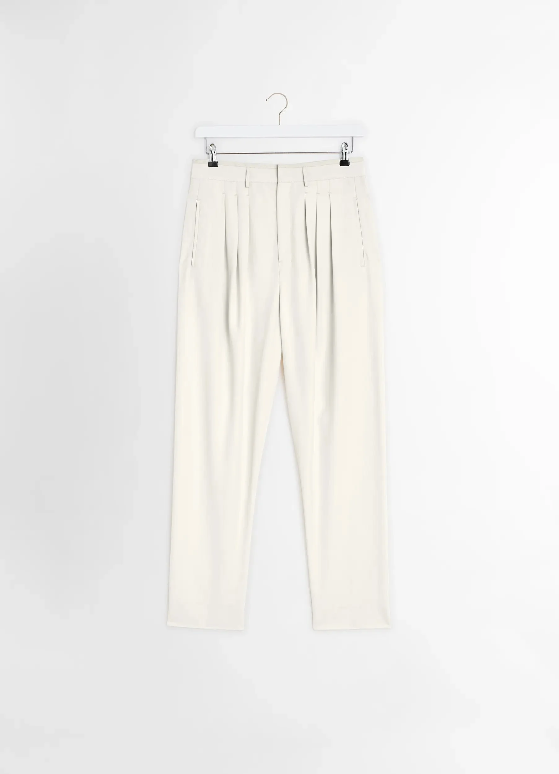 These Pleated Tailored Trousers complement the soft tailoring vestiaire this season at LEMAIRE. They are crafted in wool viscose gabardine, a light material with a flat and compact hand. Boasting three pleats at the front of each leg, they are extra comfortable thanks to their seamless leg. The relaxed fit is complemented by two welt pockets on the side and at the back, providing storage while maintaining a sleek look. A tonal contrast fabric detailing at the waist and binding around the waistband adds a sophisticated touch. These trousers seamlessly blend comfort and tailored style, making them an essential addition to any wardrobe. DETAILS - Relaxed tailored fit - 3 pleats on the front leg - Seamless leg - Welt side pockets - Welt back pockets - Tonal lining details Made in Slovakia Style: PA1178 LF1362 FABRICS & CARE Main Fabric: 54% Wool, 46% Viscose Main Lining: 100% Cotton Do not wash Do not bleach Do not tumble dry Cool ironing Soft dry clean