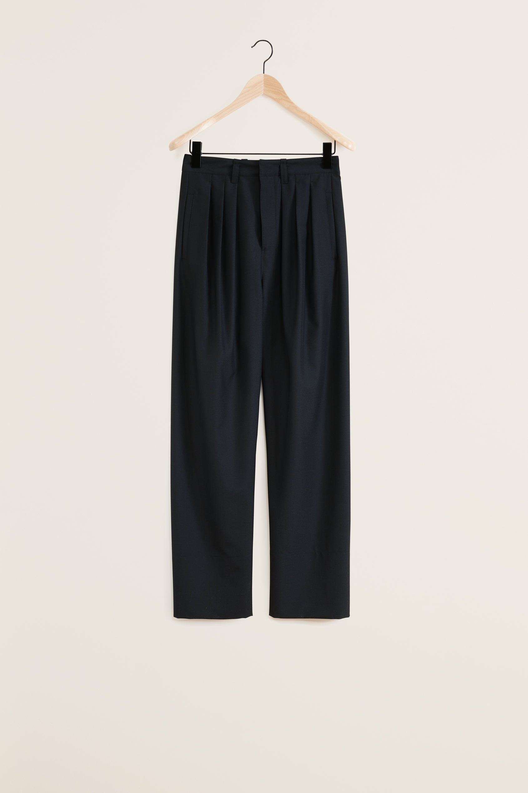 These pants are a new addition to LEMAIRE’s wardrobe. They are an interpretation of the classic Pleated family of trousers made of poly-wool woven into a mélange twill, with a dense yet supple hand for fluid tailoring. The cut is fitted, with no side seams for a slightly curved silhouette. The Pleated Tailored Pants feature three pleats at the front and a waistband with belt loops. Two side pockets and two welt pockets on the back. DETAILS Fitted shape - Straight leg - Three front pleats - Waistband with belt loops - Two back welt pockets - Two side pockets - Quilted inner hem Made in Slovakia Style: PA1093 LF414 Fabrics & Care FABRICS & CARE Main Material: 55% Polyester, 45% Wool Main Lining: 100% Cotton Do not wash Do not bleach Do not tumble dry Cool ironing Soft dry clean
