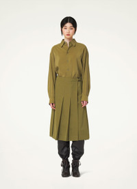 This skirt is made of wool gabardine with a smooth drape that is ideal for mid-season tailoring. It wraps around the silhouette to just below the knee with wide knife pleats in the front, fastening asymmetrically on the waist with an attached belt and metal buckle. DETAILS Straight fit Corozo buttons Removable belt with metal buckle Topstitching Midi length Interior button Back vent Made in Portugal Style : SK1016 LF1123 This model is 179 cm and is wearing a size 36/S FABRICS & CARE Main Fabric : 100% Virgin wool Do not wash Do not bleach Do not tumble dry Cool ironing Soft dry clean