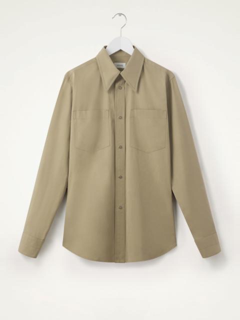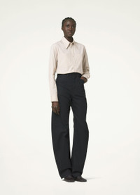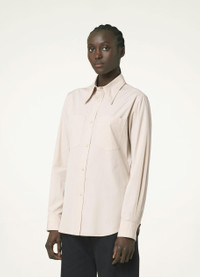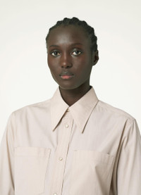 This shirt is made of a cotton and silk blended poplin with a smooth, slightly shiny surface. It has a straight, fitted silhouette that is western inspired, with a western collar with elongated points and mother-of-pearl snap buttons. Other details include a topstitched button placket, extra wide buttoned cuffs and a rounded hem. Two patch pockets and a back yoke complete its finishings. DETAILS Fitted shape Convertible collar Twin stitching Mother-of-pearl snap buttons Made in Italy Style : SH1053 LF1106 This model is 180 cm and is wearing a size 36/S FABRICS & CARE Main Fabric : 97% Coton, 3% Silk Soft wash 30° Do not bleach Do not tumble dry Cool ironing Soft dry clean