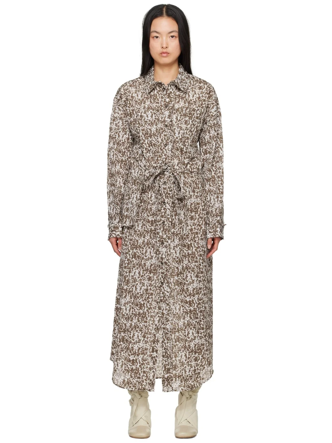 Cotton crepe gauze dress. Graphic pattern printed throughout. · Spread collar · Button closure · Patch pockets · Belt loops and detachable self-tie belt with pouch · Curved hem · Dropped shoulders · Single-button barrel cuffs Supplier color: Cream/Espresso 100% cotton. Made in Portugal 241646F054023