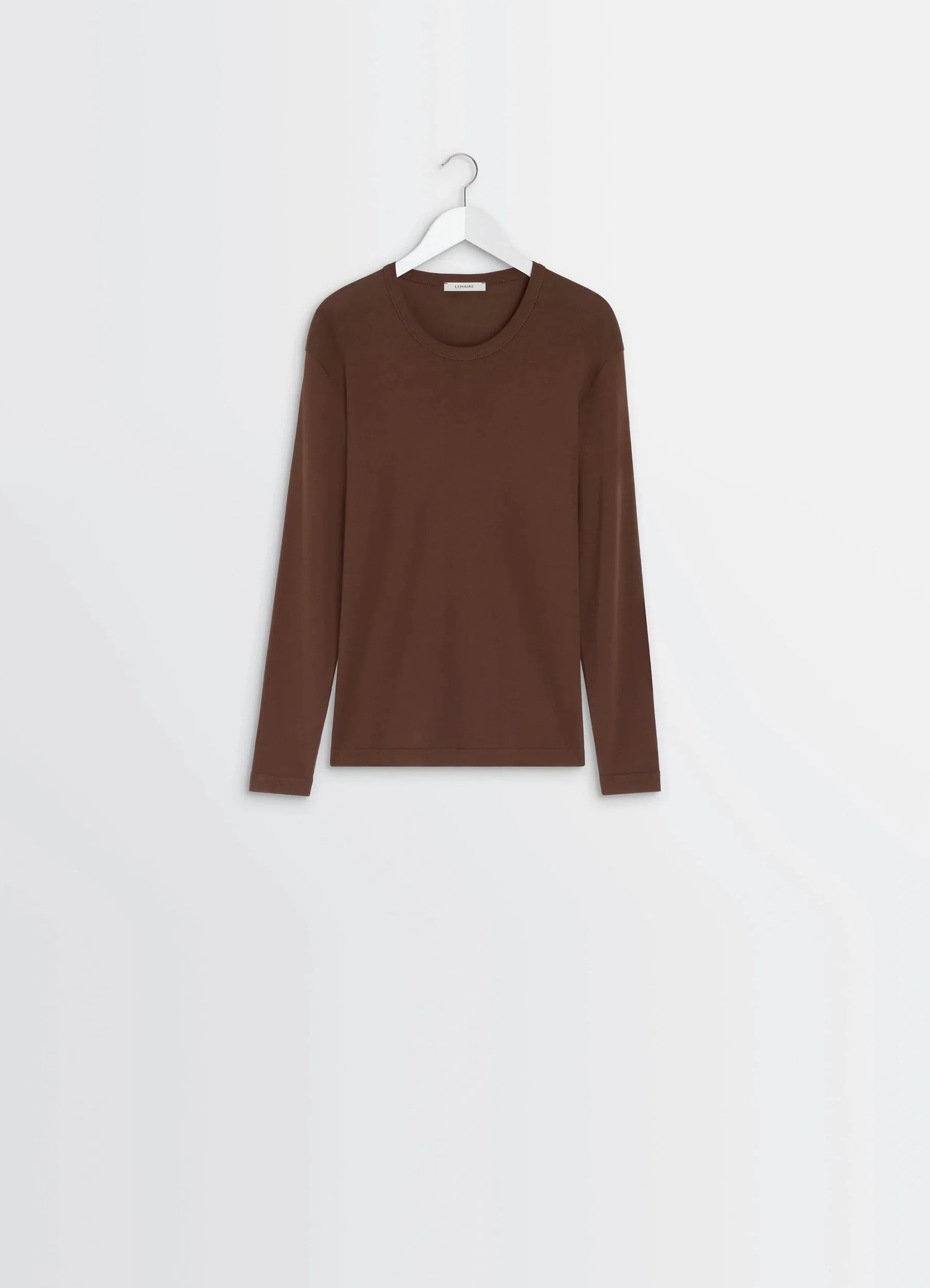 This long-sleeved t-shirt is a classic piece in the Lemaire wardrobe. It is crafted in flowing cotton jersey, knitted with supple, textured ribbing. DETAILS Long sleeve top in ribbed jersey Straight cut Ribbed crewneck Made in Portugal Style : TO1441 LJ1016 The model is 177 cm tall and is wearing a size 36 (S). FABRICS & CARE Main Material: 100% Cotton