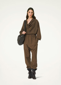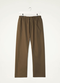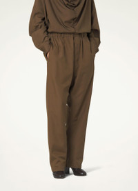 These unisex pants are made of soft silk with a smooth, fluid drape. Their pyjama-like fit is relaxed, achieved by multiple pleats below the elasticated waistband that extend down the leg. Practical details include a buttoned fly with angled stitching and side welt pockets. DETAILS Relaxed fit Corozo buttons Buttoned fly One back welt pocket Made in Hungaria Style : PA1047 LF1163 This model is 177|187 cm and is wearing a size 36/S|48/M FABRICS & CARE Main Fabric : 100% Silk Do not wash Do not bleach Do not tumble dry Cool ironing Soft dry clean