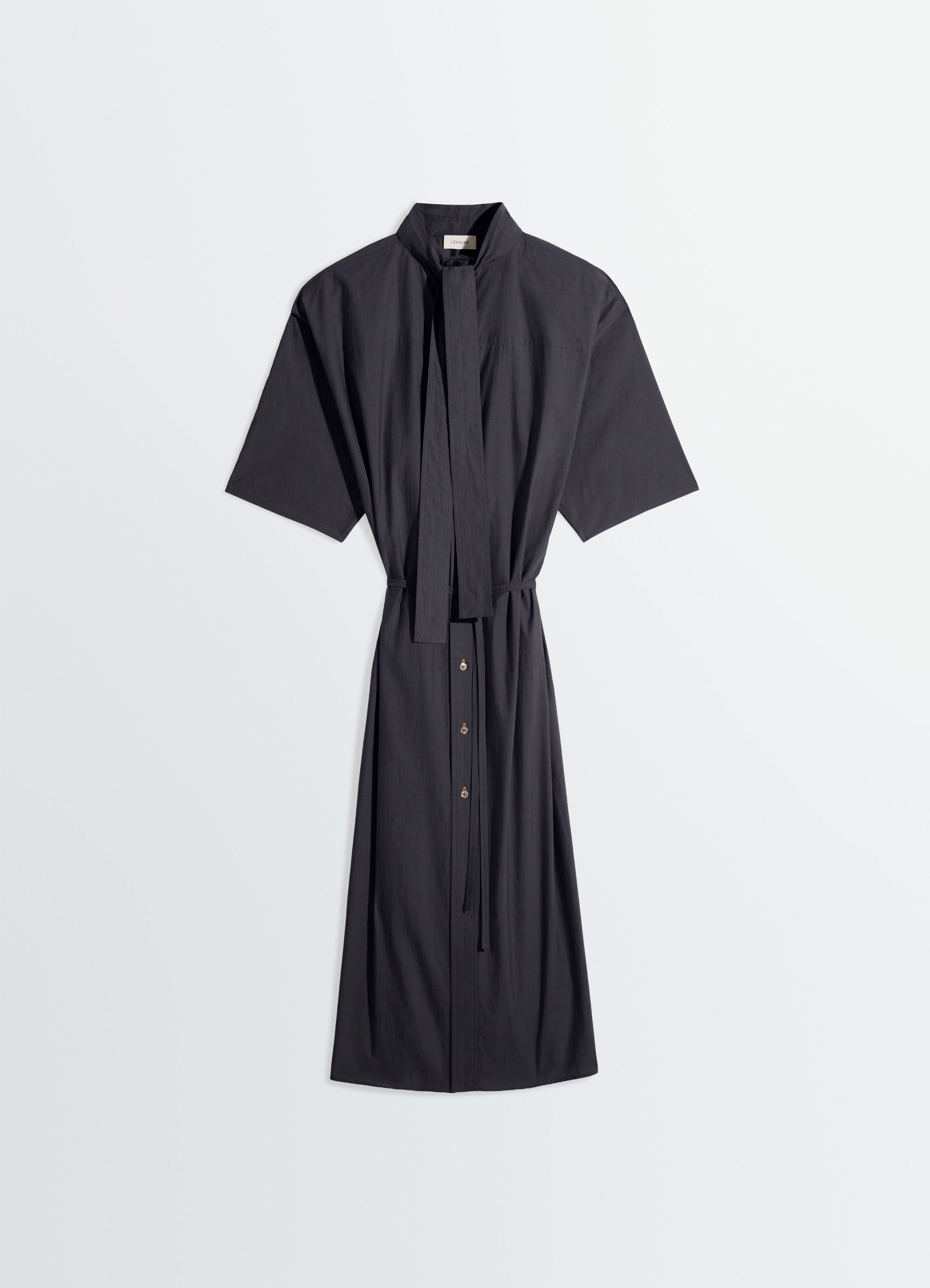 This long tube dress with a reworked volume modernizes the shirtdress with a tie-neck scarf. The cotton-and-washed-silk piece has a subtle sheen and a uniquely delicate touch. This long tube dress with a reworked volume modernizes the shirtdress with a tie-neck scarf. The cotton-and-washed-silk piece has a subtle sheen and a uniquely delicate touch. DETAILS Reversible tube dress in washed cotton and silk Long tube shape Reversible model Small collar with tie scarf Short wide sleeves Removable thin belt Button placket along front Side vents Made in Romania Style: DR1156 LF1500 Reversible tube dress in washed cotton and silk Long tube shape Reversible model Small collar with tie scarf Short wide sleeves Removable thin belt Button placket along front Side vents Made in Romania Style: DR1156 LF1500 CARE Main fabric: 80% cotton, 20% silk Do not wash Do not bleach Do not tumble dry Cool ironing Soft dry clean Main fabric: 80% cotton, 20% silk Do not wash Do not bleach Do not tumble dry Cool ironing Soft dry clean
