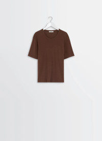 This short-sleeved t-shirt is a classic piece in the Lemaire wardrobe. It is crafted in flowing cotton jersey, knitted with supple, textured ribbing. DETAILS Short sleeve t-shirt in ribbed jersey Straight cut Ribbed crewneck Made in Portugal Style : TO1440 LJ1016 The model is 177 cm tall and is wearing a size 36 (S). FABRICS & CARE Main Material: 100% Cotton