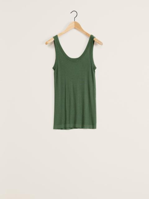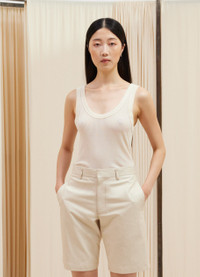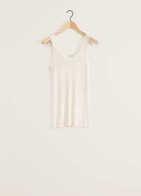 This tank top is a staple of LEMAIRE’s wardrobe and a new addition to its family of seamless garments. It is made of a smooth blend of viscose and silk, a fine and breathable fabric that has been woven using a specific savoir-faire from French manufacturer EMO. Its fitted shape features an open crewneck, rib finishing at the collar and around the straps. A discrete incorporated logo is knitted in the stitch on either side of the body. DETAILS Fitted shape Rib collar and straps LEMAIRE signature in an openwork stitch at the bottom of the garment Made in France Style: TO1156 LK1017 FABRICS & CARE Main Material: 88% Viscose / 12% Silk Hand wash Do not bleach Do not tumble dry Cool ironing Soft dry clean Dry flat