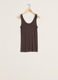 This tank top is a staple of LEMAIRE’s wardrobe and a new addition to its family of seamless garments. It is made of a smooth blend of viscose and silk, a fine and breathable fabric that has been woven using a specific savoir-faire from French manufacturer EMO. Its fitted shape features an open crewneck, rib finishing at the collar and around the straps. A discrete incorporated logo is knitted in the stitch on either side of the body. DETAILS Fitted shape Rib collar and straps LEMAIRE signature in an openwork stitch at the bottom of the garment Made in France Style: TO1156 LK1017 FABRICS & CARE Main Material: 88% Viscose / 12% Silk Hand wash Do not bleach Do not tumble dry Cool ironing Soft dry clean Dry flat