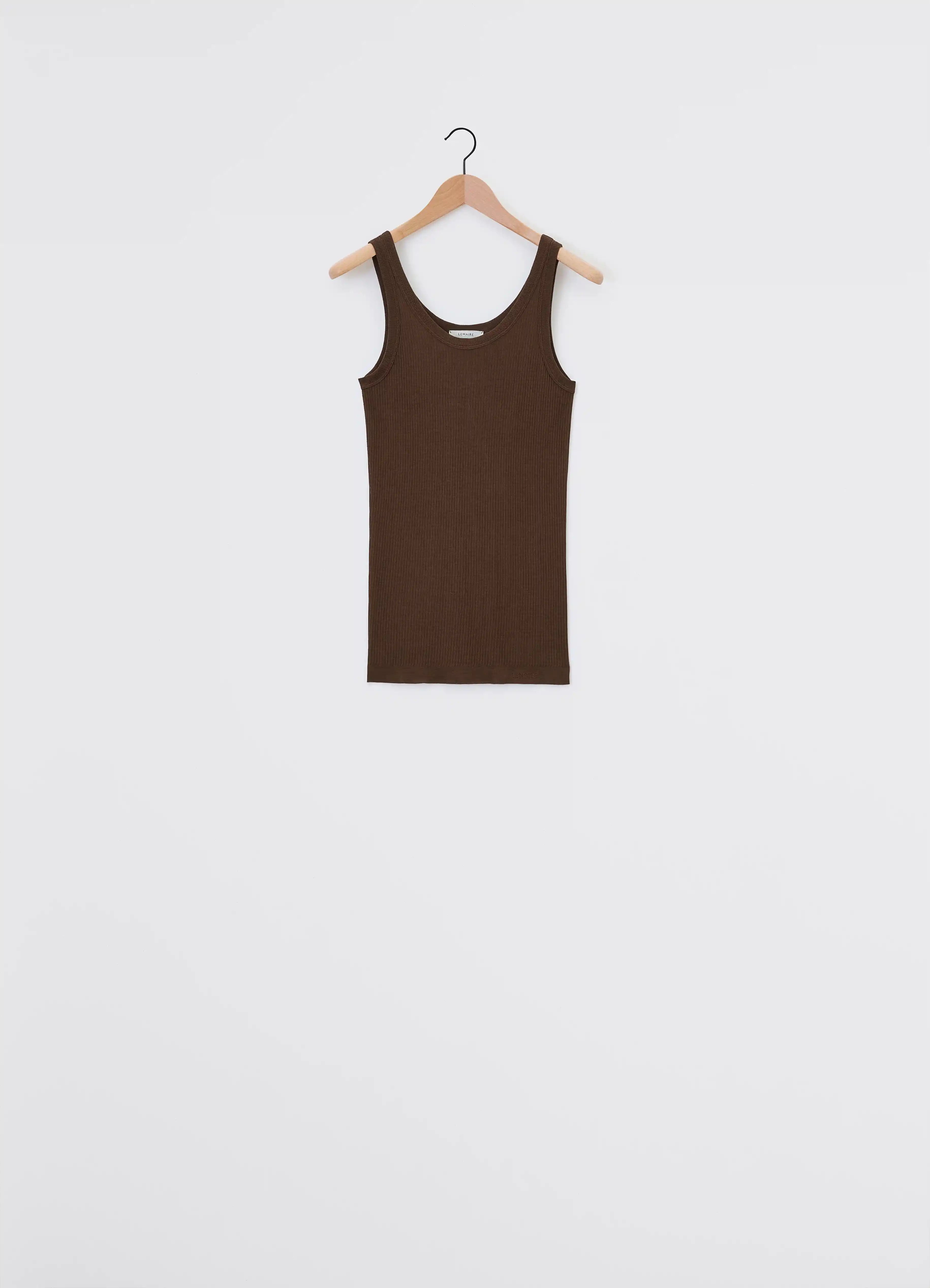 This tank top is a staple of LEMAIRE’s wardrobe and a new addition to its family of seamless garments. It is made of a smooth blend of viscose and silk, a fine and breathable fabric that has been woven using a specific savoir-faire from French manufacturer EMO. Its fitted shape features an open crewneck, rib finishing at the collar and around the straps. A discrete incorporated logo is knitted in the stitch on either side of the body. DETAILS - Fitted shape - Rib collar and straps - LEMAIRE signature in an openwork stitch at the bottom of the garment Made in France Style: TO1156 LK1017 FABRICS & CARE Main Fabric: 88% Viscose / 12% Silk Hand wash Do not bleach Do not tumble dry Cool ironing Soft dry clean Dry flat
