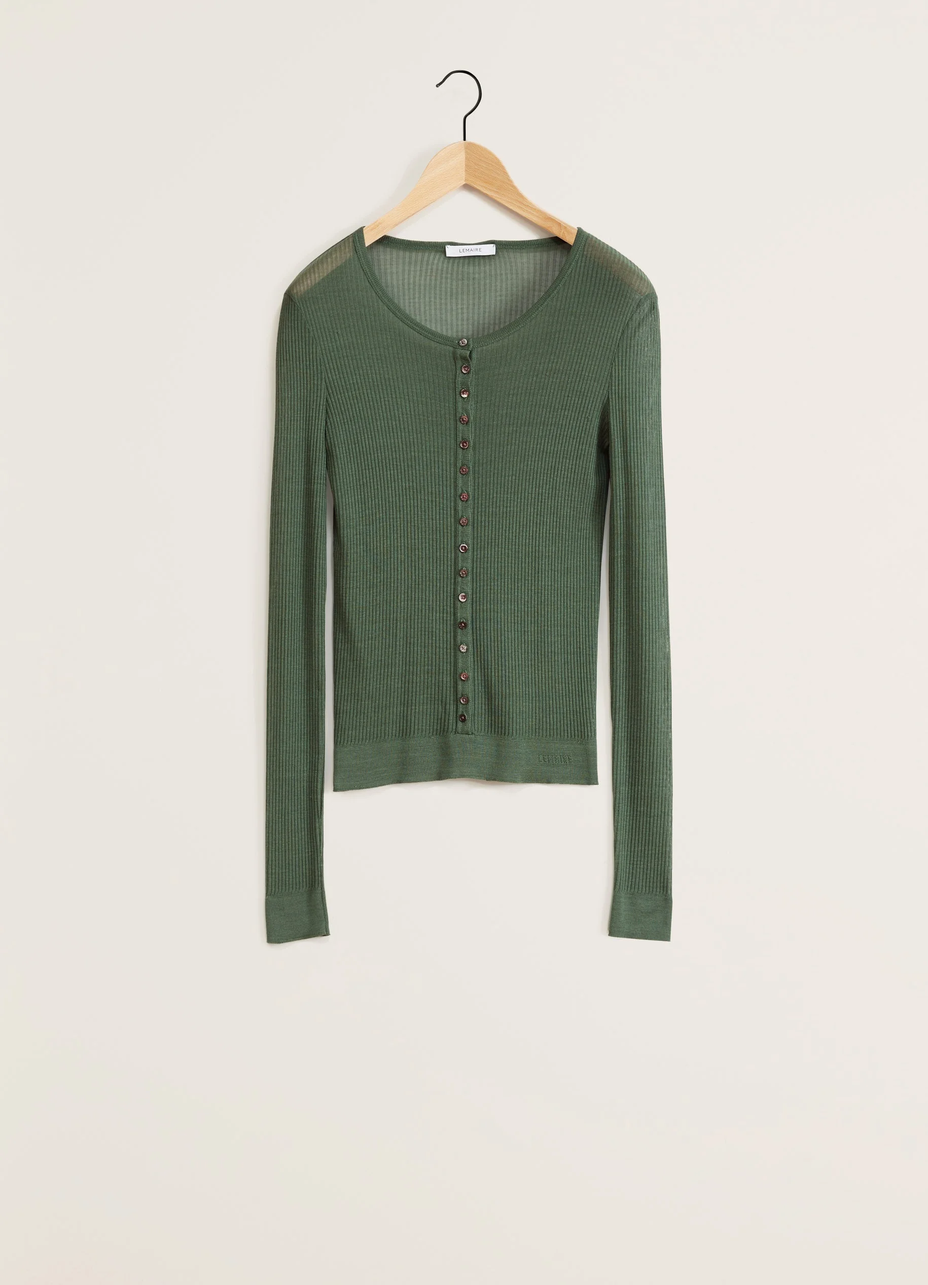 This top is a new addition in LEMAIRE’s family of seamless garments. It is made in a smooth blend of viscose and silk, a fine and breathable fabric that has been woven using a specific savoir-faire from French manufacturer EMO. Circular knitting allows this top to bear no seams and to offer a delicate texture, close to the body, almost like a second skin. It also features a thick double-needle stitch which details the round neck, rib finishing at the cuffs and the hem as well as a discrete incorporated logo knitted in an openwork stitch at the bottom of the garment. DETAILS Fitted shape Second skin Rib finishing at the cuffs and the hem Button placket Mother-of-pearls button Rib knitting LEMAIRE signature in an openwork stitch at the bottom of the garment Made in France Style: TO1157 LK1017 FABRICS & CARE Main Material: 88% Viscose / 12% Silk Hand wash Do not bleach Do not tumble dry Cool ironing Soft dry clean Dry flat