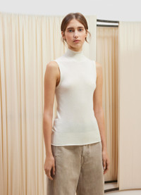This top is a staple of LEMAIRE’s wardrobe and its family of seamless garments. It has been woven using a specific savoir-faire from French manufacturer EMO in fine cotton cashmere with a soft hand and a second skin feel. This Sleeveless Top has a high neck collar and low armholes both circled by rib finishing. A discrete incorporated logo is knitted in the stitch on either side of the body. DETAILS Fitted shape Straight cut Rib collar and armholes LEMAIRE signature in an openwork stitch at the bottom of the garment Made in France Style: TO1150 LK1015 FABRICS & CARE Main Material: 70% Cotton 30% Cashmere Do not wash Do not bleach Do not tumble dry Cool ironing Soft dry clean