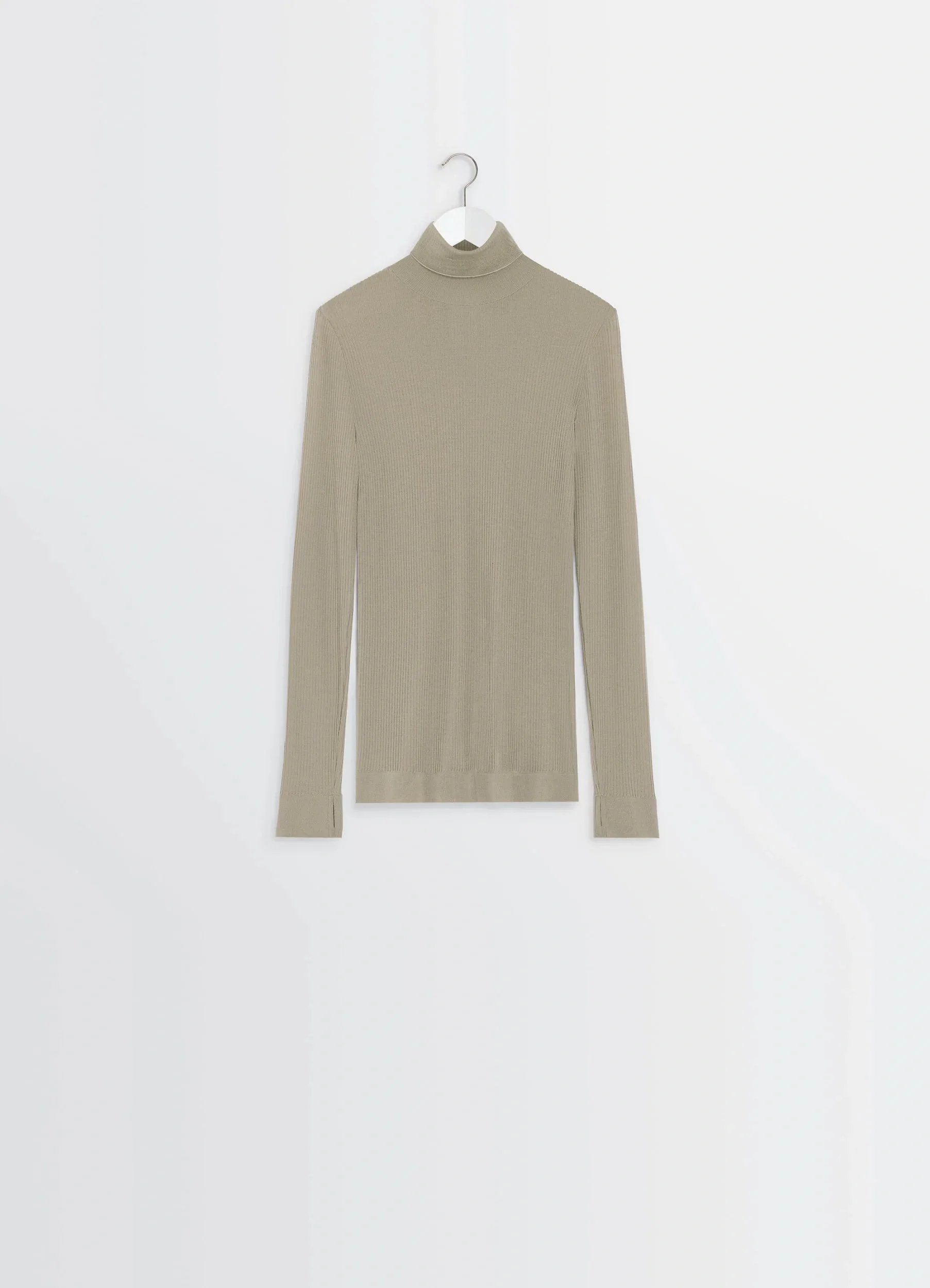This seamless top with high-neck collar is a Lemaire wardrobe essential. Crafted in finely ribbed merino wool, it is a lightweight piece whose knit was developed by EMO, a French manufacturer specializing in tubular garments. DETAILS Seamless high neck top in ribbed fine merino wool Fitted cut Long sleeves Cuffs with thumbhole Rib-knit trim Made in France Style : TO1460 LK1032 The model is 177 cm and is wearing a size 36 (S). FABRICS & CARE Main Material: 100% Wool