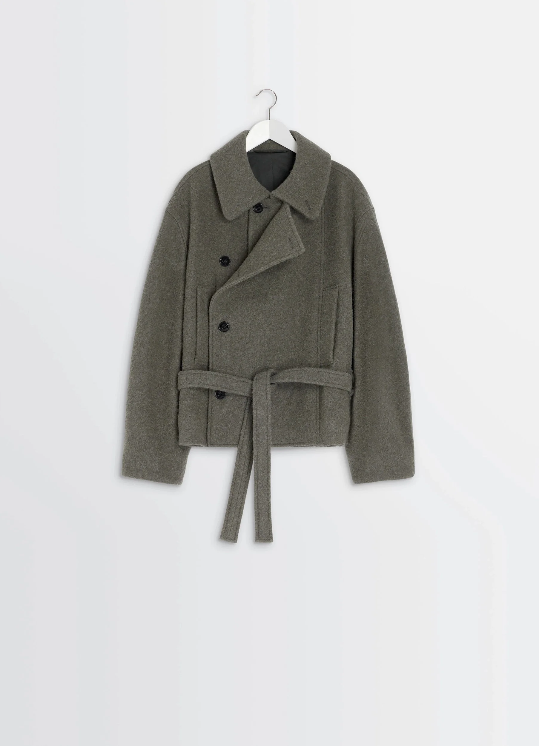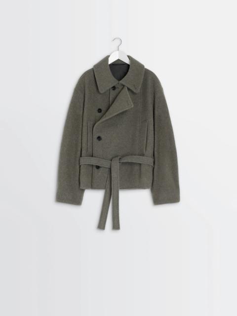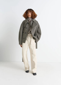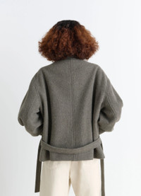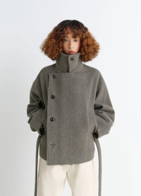 This short, asymmetrical coat features a button-down or loose panel, inspired by Lemaire's love of movement. This piece is crafted in a rich, warm fabric. The wool-alpaca blend gives it texture and relief, as well as lightness. DETAILS Asymmetrical short coat in a wool and alpaca blend Oversized cut Fully lined model Shirt collar Front button closure Panel with assymetrical button closure Long sleeves Side raglan pockets Side belt loops Removable matching belt Inside patch pockets Made in Romania Style : CO1149 LF504 The model is 177 cm tall and is wearing a size 36 (S). FABRICS & CARE Main Material: 50% Wool 50% Alpaca Main Lining: 100% Cotton Second Lining: 51% Cotton 49% Viscose
