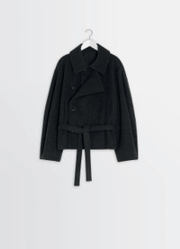 This short, asymmetrical coat features a button-down or loose panel, inspired by Lemaire's love of movement. This piece is crafted in a rich, warm fabric. The wool-alpaca blend gives it texture and relief, as well as lightness. DETAILS Asymmetrical short coat in a wool and alpaca blend Oversized cut Fully lined model Shirt collar Front button closure Panel with assymetrical button closure Long sleeves Side raglan pockets Side belt loops Removable matching belt Inside patch pockets Made in Romania Style : CO1149 LF504 The model is 177 cm tall and is wearing a size 36 (S). FABRICS & CARE Main Material: 50% Wool 50% Alpaca Main Lining: 100% Cotton Second Lining: 51% Cotton 49% Viscose