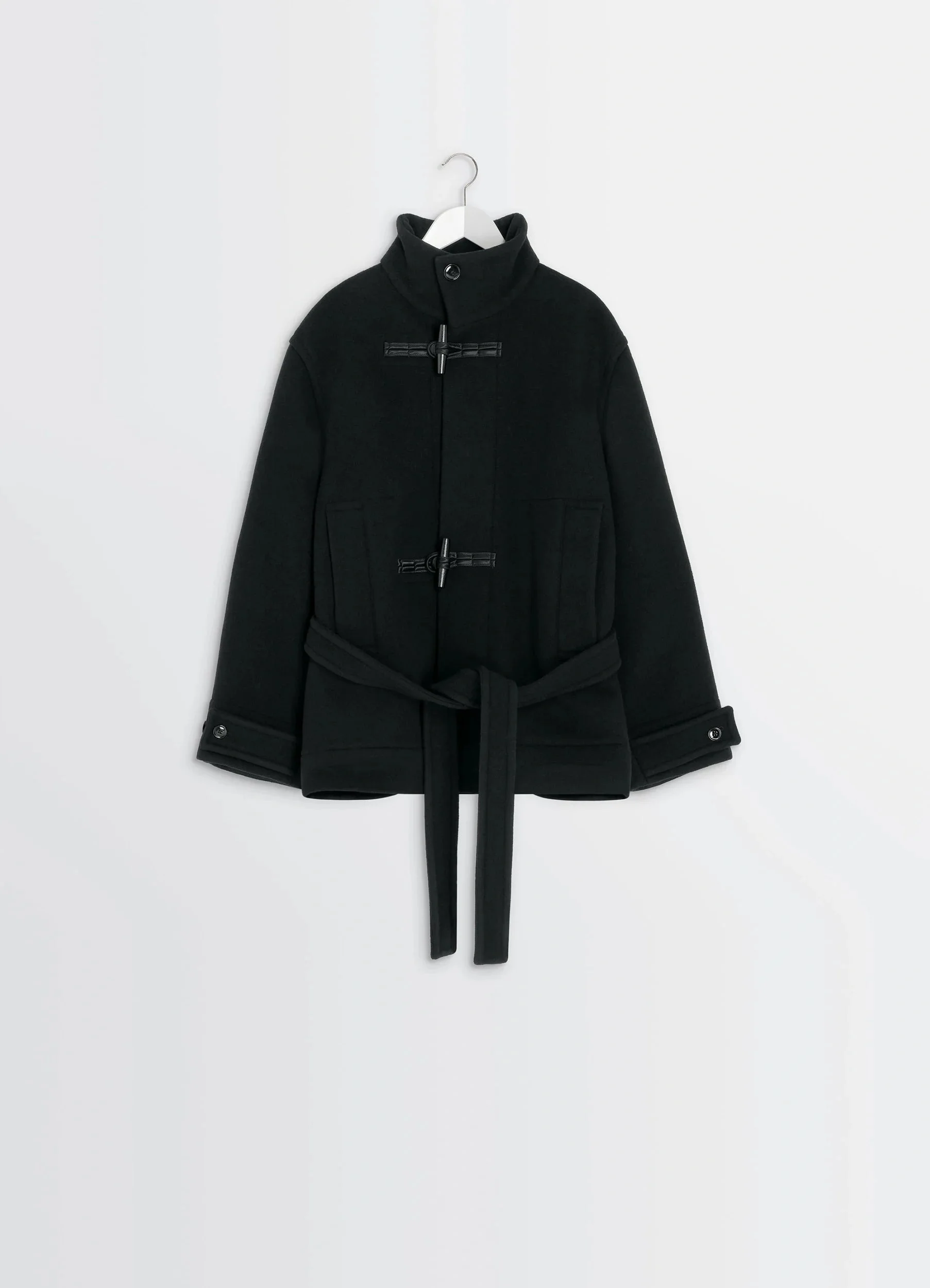 This duffle coat is an archetypal piece reinterpreted by Lemaire with shiny piping and utilitarian metallic details. Crafted in double-faced wool, it offers a soft, warm wear. This piece is an ideal combination of sophistication and functionality. The model is 177 cm tall and is wearing a size 36 (S). DETAILS Short double-faced wool duffle coat Oversized cut Unlined model Buttoned stand-up collar Long sleeves finished off with buttoned tabs Closure with snaps and satin frog fasteners Side pockets Belt loops at the back Removable belt Inside patch pocket with buttoned closure Interior tab for hand carry Interior herringbone ribbon trim Made in Lithuania Style : CO1113 LF1116 CARE Main Material: 100% Wool Main Lining: 100% Cotton